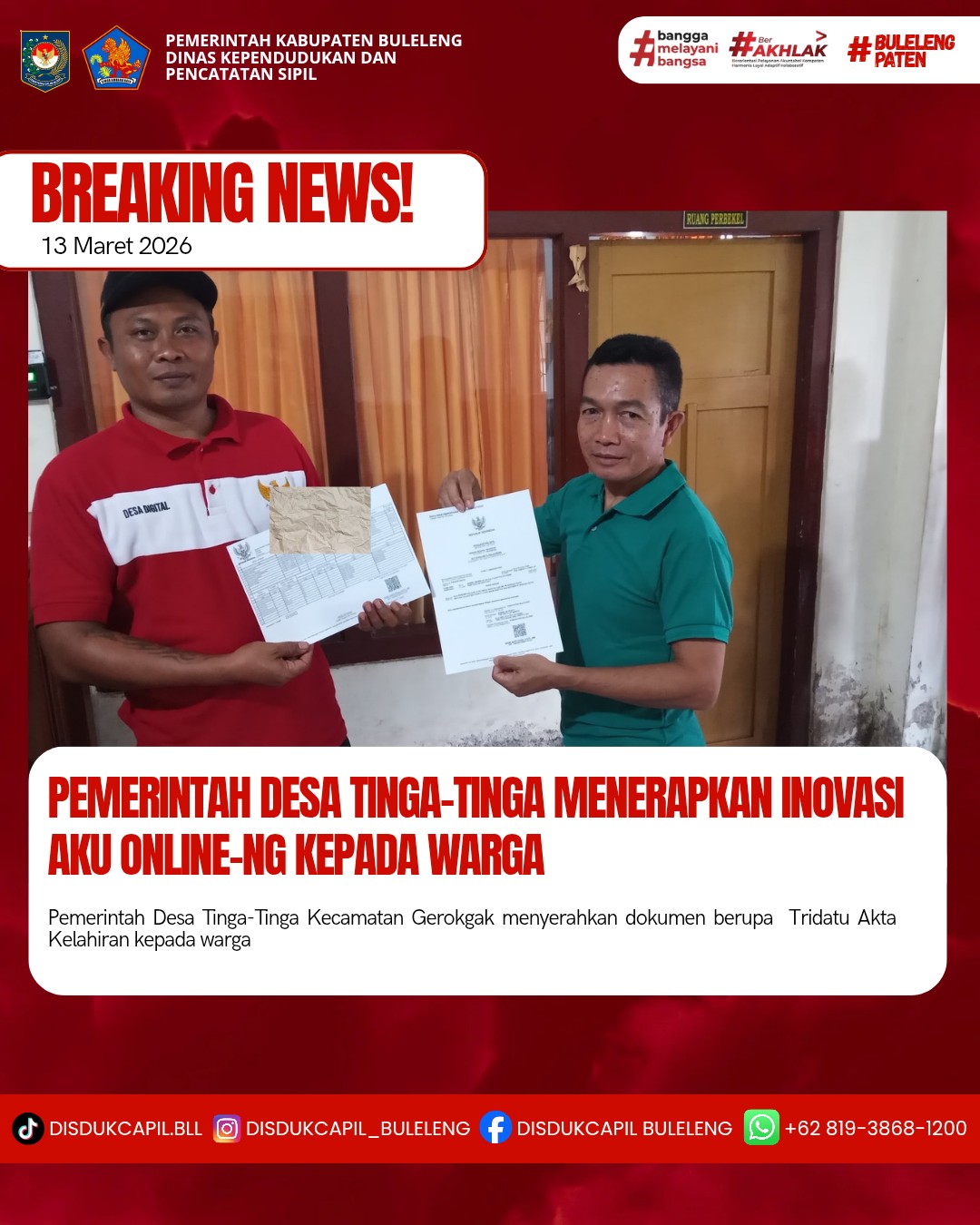 Pemerintah Kabupaten Buleleng melalui Dinas Kependudukan dan Pecatatan Sipil (Disdukcapil) Kabupaten Buleleng memaksimalkan serta mempermudah pelayanan kependudukan masyarakat dengan beberapa inovasi, melalui aplikasi AKU Online-NG. Dimana dalam penerapan aplikasi Aku Online-NG tersebut masyarakat tidak perlu lagi datang ke Dinas Dukcapil untuk melakukan pelayanan langsung cukup dengan datang ke Desa nanti akan dibantu oleh operator Desa masing-masing. Di Desa Tinga-Tinga Kecamatan Gerokgak, telah diserahkan dokumen kependudukan berupa Akta Kelahiran atas nama MADE WARINI dan Kartu Keluarga baru atas nama MADE ARTAWAN, Banjar Dinas Bubunan, yang diserahkan langsung oleh Kasi Pemerintahan Desa Tinga-Tinga, Jumat (13/3).