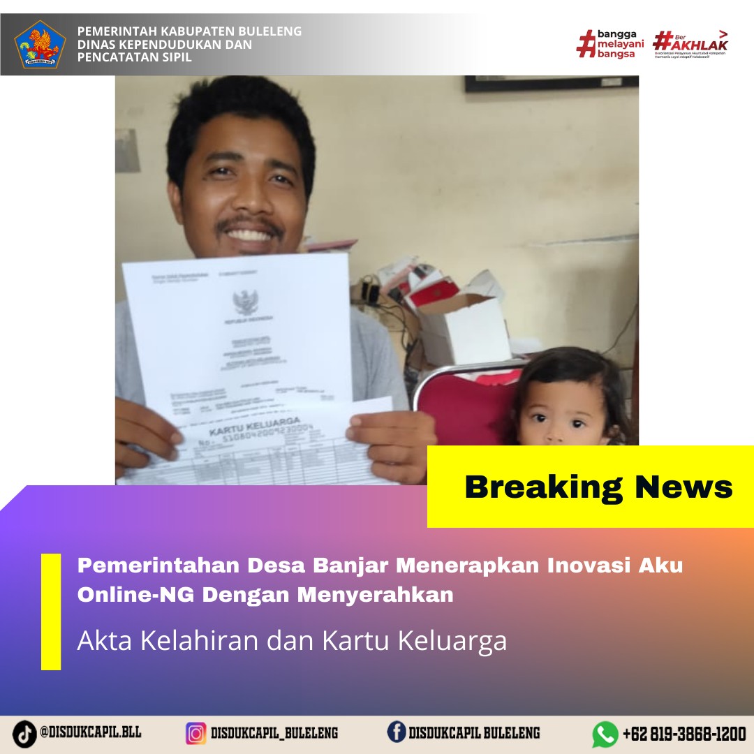 Pemerintah Kabupaten Buleleng melalui Dinas Kependudukan dan Pecatatan Sipil (Disdukcapil) Kabupaten Buleleng memaksimalkan serta mempermudah pelayanan kependudukan masyarakat dengan beberapa inovasi, melalui aplikasi AKU Online-NG. Dimana dalam penerapan aplikasi Aku Online-NG tersebut masyarakat tidak perlu lagi datang ke Dinas Dukcapil untuk melakukan pelayanan langsung cukup dengan datang ke Desa nanti akan dibantu oleh operator Desa masing-masing. Di Desa Banjar Kecamatan Banjar, telah diserahkan dokumen kependudukan berupa Akta Kelahiran dan Kartu Keluarga atas nama IDA KADE YASTANA warga Banjar Dinas Ambengan Desa Banjar yang diserahkan langsung oleh Pemerintah Desa Banjar Kecamatan Banjar, Kabupaten Buleleng, Kamis (4/12).