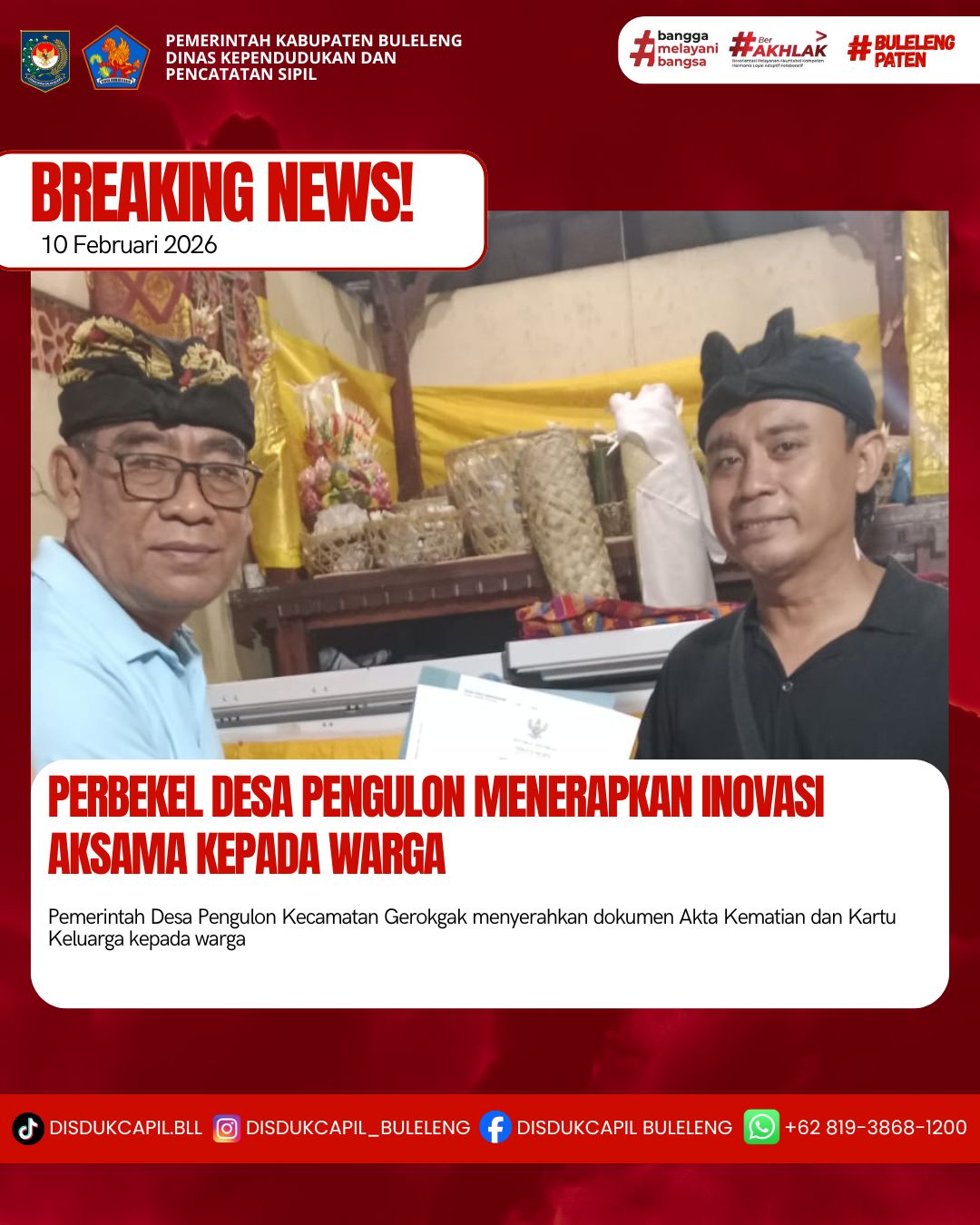 Pemerintah Kabupaten Buleleng melalui Dinas Kependudukan dan Pecatatan Sipil (Disdukcapil) Kabupaten Buleleng memaksimalkan serta mempermudah pelayanan kependudukan masyarakat dengan beberapa inovasi, yakni BALITA (Bayi Lahir Berakta), NYAKSI (Menyerahkan Akta Kawin Saat Acara Perkawinan) dan AKSAMA ( Akta Kematian Diserahkan Saat Masih Berduka) melalui aplikasi Aku Online-NG. Di Desa Pengulon Kecamatan Gerokgak, telah diterapkan program Aksama (Akta Kematian Diserahkan Saat Masih Berduka) yang dilakukan secara langsung oleh Perbekel Desa Pengulon Drs. I Nyoman Juliana dengan menyerahkan Akta Kematian atas nama Luh Lajri dan Kartu Keluarga atas nama Ketut Santa Maria kepada pihak keluarga di rumah duka di Desa Pengulon, Selasa (10/2).