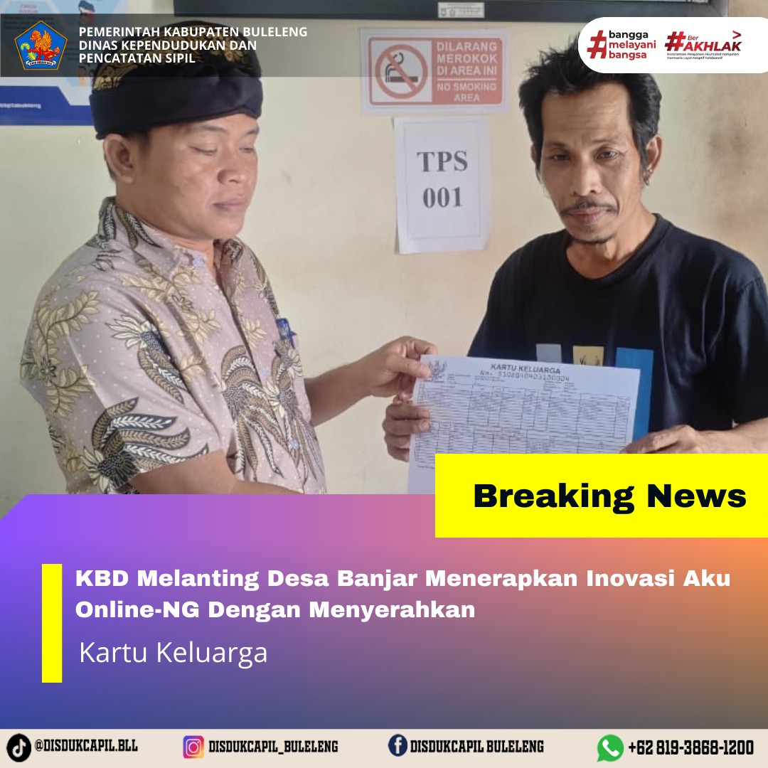 Pemerintah Kabupaten Buleleng melalui Dinas Kependudukan dan Pecatatan Sipil (Disdukcapil) Kabupaten Buleleng memaksimalkan serta mempermudah pelayanan kependudukan masyarakat dengan beberapa inovasi, melalui aplikasi AKU Online. Dimana dalam penerapan aplikasi Aku Online tersebut masyarakat tidak perlu lagi datang ke Dinas Dukcapil untuk melakukan pelayanan langsung cukup dengan datang ke Desa nanti akan dibantu oleh operator Desa masing-masing. Di Desa Banjar Kecamatan Banjar telah diserahkan dokumen kependudukan berupa Kartu Keluarga atas nama IDA KETUT SUARTANA warga Banjar Dinas Melanting yang diserahkan oleh Sekretaris Desa Banjar Kecamatan Banjar, Kamis (11/9).