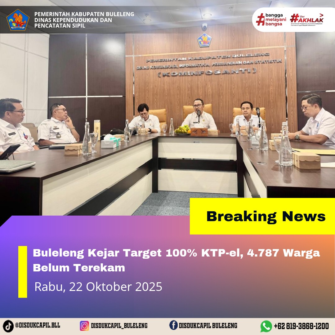 Pemerintah Kabupaten Buleleng semakin gencar dalam mempercepat perekaman Kartu Tanda Penduduk elektronik (KTP-el), dengan fokus utama menargetkan wajib KTP pemula, khususnya pelajar. Komitmen tersebut ditegaskan oleh Sekretaris Daerah Kabupaten Buleleng, Drs. Gede Suyasa, M.Pd., dalam Rapat Koordinasi Penuntasan Wajib KTP-el Tahun 2025 yang digelar di Dinas Kominfosanti Buleleng pada Rabu (22/10).