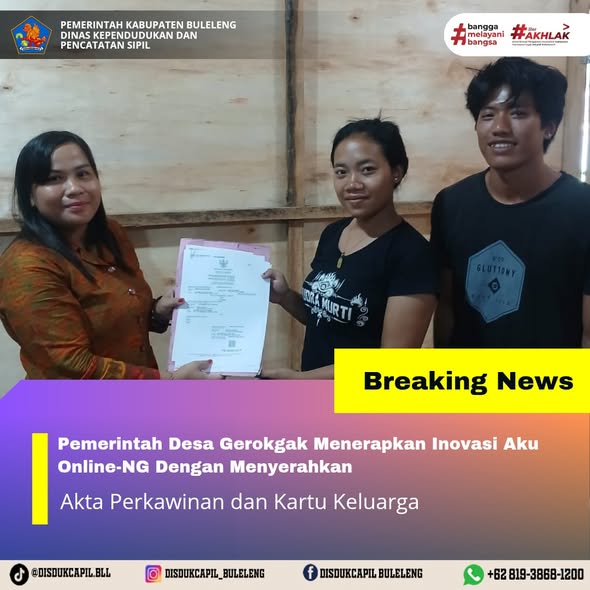 Pemerintah Kabupaten Buleleng melalui Dinas Kependudukan dan Pecatatan Sipil (Disdukcapil) Kabupaten Buleleng memaksimalkan serta mempermudah pelayanan kependudukan masyarakat dengan beberapa inovasi, melalui aplikasi AKU Online. Dimana dalam penerapan aplikasi Aku Online tersebut masyarakat tidak perlu lagi datang ke Dinas Dukcapil untuk melakukan pelayanan langsung cukup dengan datang ke Desa nanti akan dibantu oleh operator Desa masing-masing. Di Desa Gerokgak Kecamatan Gerokgak telah diserahkan dokumen kependudukan berupa Akta Perkawinan dan Kartu Keluarga atas nama Putu Yohan Sandro Lesmana yang diserahkan langsung oleh pemerintahan di Banjar Dinas Batuagung Pidada Desa Gerokgak, Selasa (11/11).