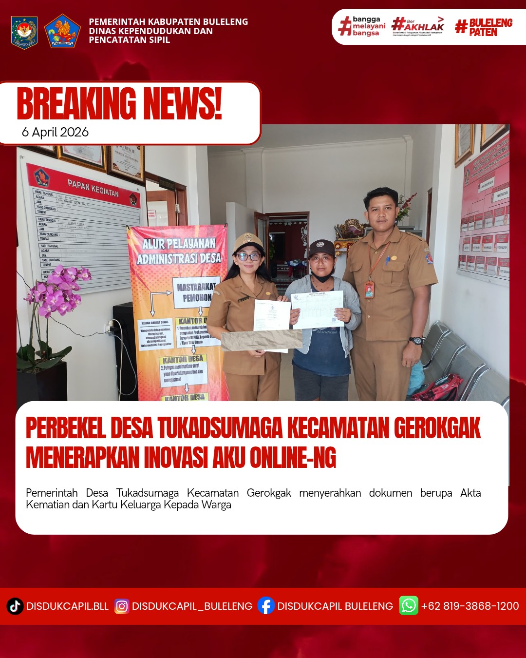 Pemerintah Kabupaten Buleleng melalui Dinas Kependudukan dan Pecatatan Sipil (Disdukcapil) Kabupaten Buleleng memaksimalkan serta mempermudah pelayanan kependudukan masyarakat dengan beberapa inovasi, melalui aplikasi AKU Online-NG. Dimana dalam penerapan aplikasi Aku Online-NG tersebut masyarakat tidak perlu lagi datang ke Dinas Dukcapil untuk melakukan pelayanan langsung, cukup dengan datang ke Desa nanti akan dibantu oleh operator Desa masing-masing. Di Desa Tukadsumaga Kecamatan Gerokgak, telah diserahkan dokumen kependudukan berupa Kartu Keluarga Mandiri atas nama I MADE DANA dan akta kematian istrinya atas nama NI NENGAH CENIK yang diserahkan oleh Perbekel Desa Tukadsumaga Anak Agung Sri Wathi didampingi oleh Kelian Banjar Dinas Gandongan Cemara, Putu Suta Maharta di Desa Tukadsumaga, Senin (6/4).