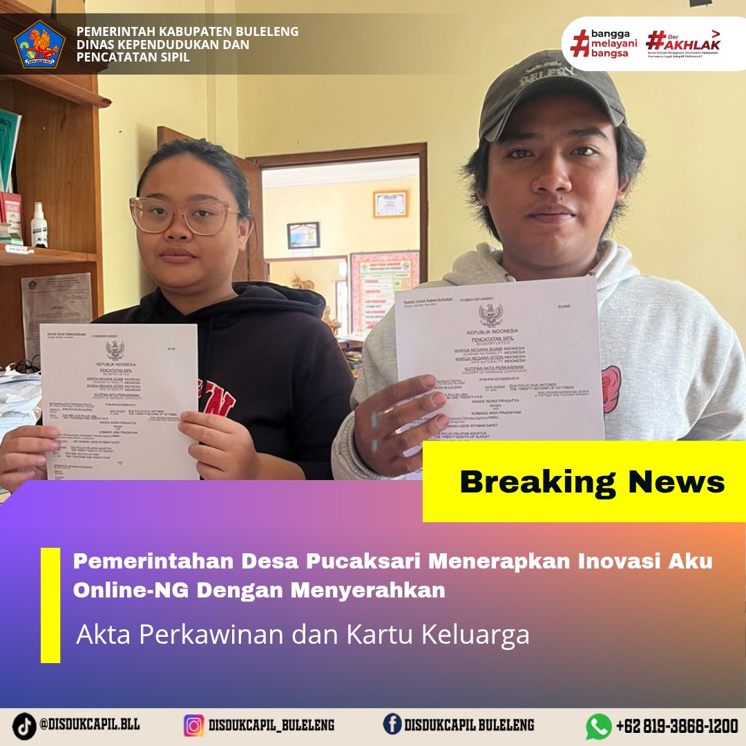 Pemerintah Kabupaten Buleleng melalui Dinas Kependudukan dan Pecatatan Sipil (Disdukcapil) Kabupaten Buleleng memaksimalkan serta mempermudah pelayanan kependudukan masyarakat dengan beberapa inovasi, melalui aplikasi AKU Online-NG. Dimana dalam penerapan aplikasi Aku Online-NG tersebut masyarakat tidak perlu lagi datang ke Dinas Dukcapil untuk melakukan pelayanan langsung cukup dengan datang ke Desa nanti akan dibantu oleh operator Desa masing-masing. Di Desa Pucaksari Kecamatan Busungbiu, telah diserahkan dokumen kependudukan berupa Akta Perkawinan dan Kartu Keluarga atas nama Kadek Indra Prasatya yang diserahkan secara langsung oleh Pemerintah Desa Pucaksari, Rabu (22/10).