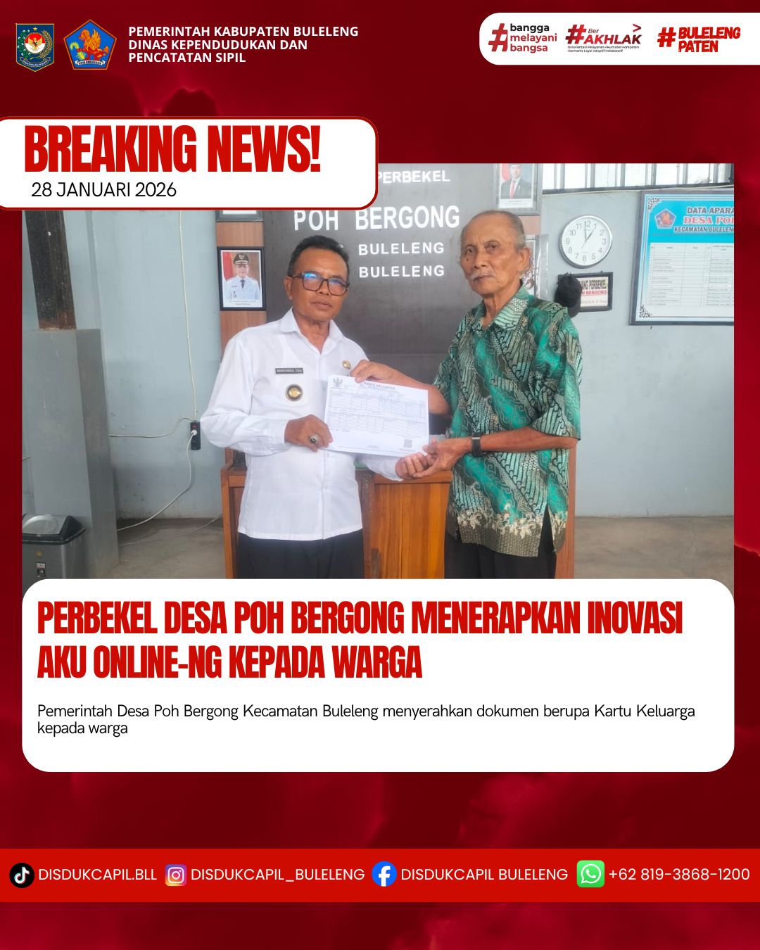 Pemerintah Kabupaten Buleleng melalui Dinas Kependudukan dan Pecatatan Sipil (Disdukcapil) Kabupaten Buleleng memaksimalkan serta mempermudah pelayanan kependudukan masyarakat dengan beberapa inovasi, melalui aplikasi AKU Online. Dimana dalam penerapan aplikasi Aku Online tersebut masyarakat tidak perlu lagi datang ke Dinas Dukcapil untuk melakukan pelayanan langsung cukup dengan datang ke Desa nanti akan dibantu oleh operator Desa masing-masing. Di Desa Poh Bergong Kecamatan Buleleng telah diserahkan dokumen kependudukan berupa Kartu Keluarga atas nama Kadek Karsana yang diserahkan langsung oleh Perbekel Desa Poh Bergong Kecamatan Buleleng Wayan Wagia, S.Sos, Rabu (28/1).