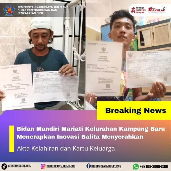Pemerintah Kabupaten Buleleng melalui Dinas Kependudukan dan Pencatatan Sipil (Disdukcapil) Kabupaten Buleleng memaksimalkan serta mempermudah pelayanan kependudukan masyarakat dengan beberapa inovasi, yakni BALITA (Bayi Lahir Berakta), NYAKSI (Menyerahkan Akta Kawin Saat Acara Perkawinan) dan AKSAMA ( Akta Kematian Diserahkan Saat Masih Berduka) melalui aplikasi Aku Online-NG. Di Kampung Baru Kecamatan Buleleng, telah diserahkan BALITA (Bayi Lahir Berakta) dan Kartu Keluarga (KK) yang dilakukan secara langsung oleh Praktek Bidan Mandiri Mariati, yang beralamat di Kampung Baru Kecamatan Buleleng kepada masyarakat yang baru memiliki bayi, Senin (3/11).