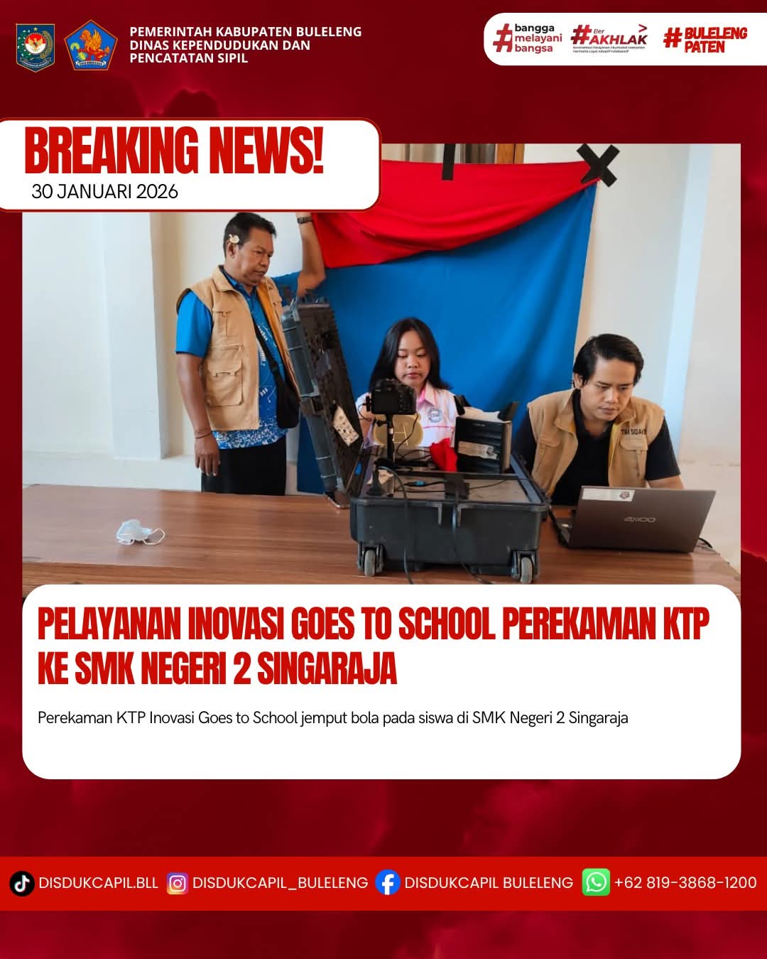 Pada kali ini Jumat, 30 Januari 2026 pelayanan perekaman KTP-el dilaksanakan di SMK Negeri 2 Singaraja. Hasil perekaman di SMK Negeri 2 Singaraja dengan data BNBA sebanyak 483 orang dan total yang melakukan perekaman sebanyak 80 orang, dimana hasil perekaman data di dalam BNBA sebanyak 80 orang dan tidak ada data di luar BNBA yang melakukan perekaman. Dilihat dari hasil tersebut sisa data BNBA yang belum perekaman sebanyak 403 orang keterangan dari pihak sekolah siswa yang belum perekaman dilanjutkan Hari Jumat depan.