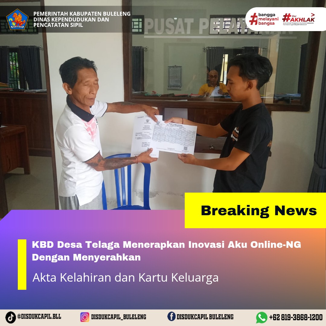 Pemerintah Kabupaten Buleleng melalui Dinas Kependudukan dan Pecatatan Sipil (Disdukcapil) Kabupaten Buleleng memaksimalkan serta mempermudah pelayanan kependudukan masyarakat dengan beberapa inovasi, melalui aplikasi AKU Online-NG. Dimana dalam penerapan aplikasi Aku Online-NG tersebut masyarakat tidak perlu lagi datang ke Dinas Dukcapil untuk melakukan pelayanan langsung cukup dengan datang ke Desa nanti akan dibantu oleh operator Desa masing-masing. Di Desa Telaga Kecamatan Busungbiu, telah diserahkan dokumen kependudukan berupa Akta Kelahiran atas nama Kadek Aira Dwika Maharani dan Kartu Keluarga atas nama I Wayan Nova Krisna Permana yang diserahkan langsung oleh Kelian Banjar Dinas Desa Telaga bertempat di Kantor Perbekel Desa Telaga, Kecamatan Busungbi, Kabupaten Buleleng, Senin (22/12).