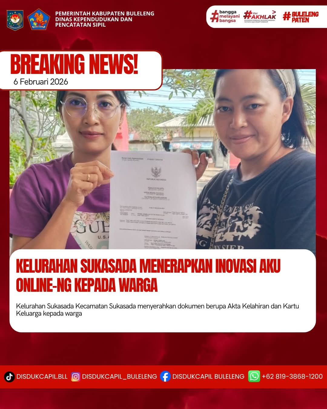 Pemerintah Kabupaten Buleleng melalui Dinas Kependudukan dan Pecatatan Sipil (Disdukcapil) Kabupaten Buleleng memaksimalkan serta mempermudah pelayanan kependudukan masyarakat dengan beberapa inovasi, melalui aplikasi AKU Online-NG. Dimana dalam penerapan aplikasi Aku Online-NG tersebut masyarakat tidak perlu lagi datang ke Dinas Dukcapil untuk melakukan pelayanan langsung cukup dengan datang ke Desa nanti akan dibantu oleh operator Desa masing-masing. Di Kelurahan Sukasada Kecamatan Sukasada, telah diserahkan dokumen kependudukan berupa Akta Kelahiran dan Kartu Keluarga atas nama Nyoman Merta Widi warga Lingkungan Bakung, Kelurahan Sukasada yang diserahkan langsung oleh Kasi Pemerintahan Kelurahan Sukasada Kecamatan Sukasada, Kabupaten Buleleng, Jumat (6/2).
