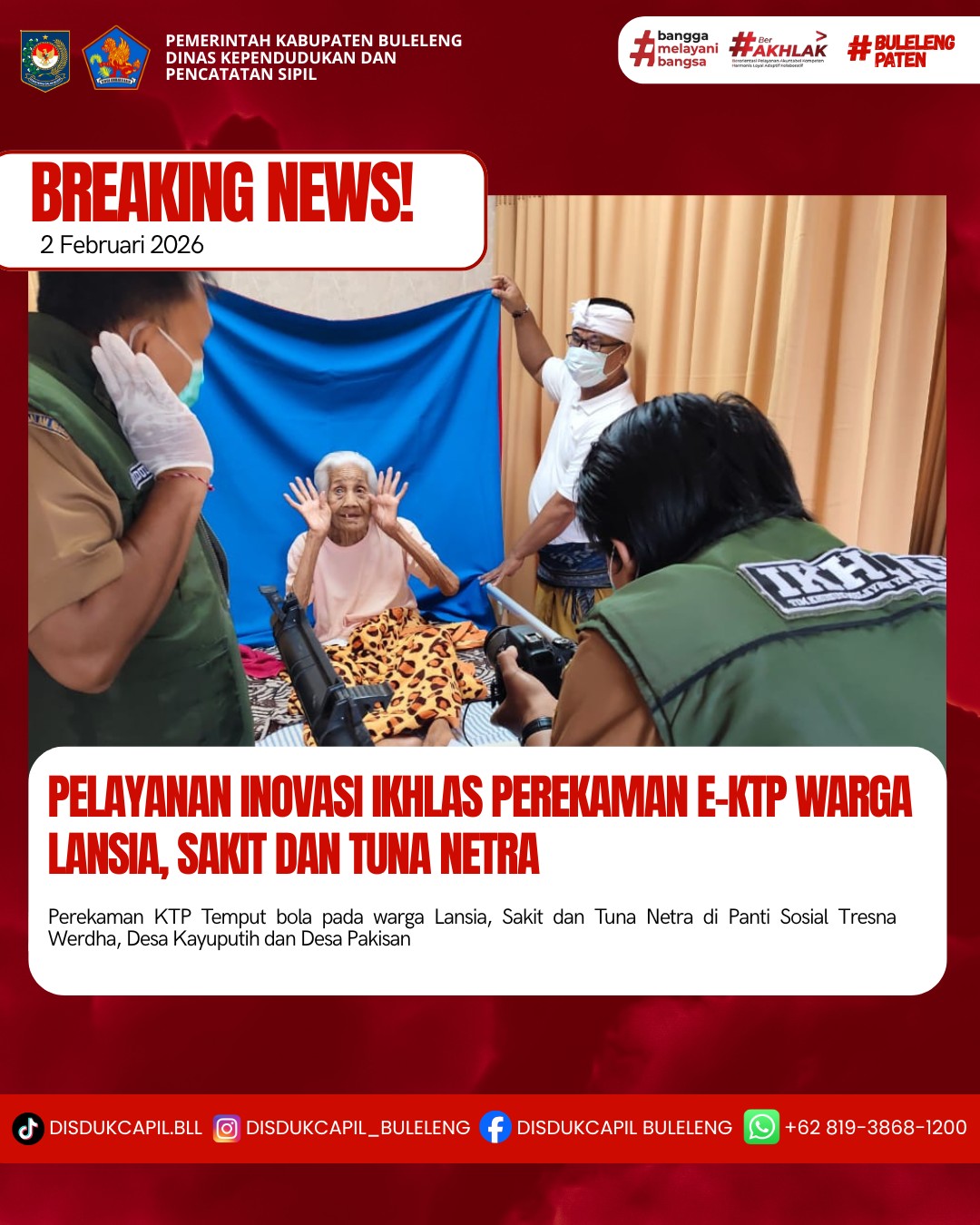 Pada hari ini Senin, 2 Februari 2026 Dinas Kependudukan dan Pencatatan Sipil Kabupaten Buleleng melaksanakan penerapan Inovasi Ikhlas dengan melakukan jemput bola kepada masyarakat untuk melakukan perekaman KTP-El kepada warga Lansia, Sakit dan Tuna Netra di Panti Sosial Tresna Werdha, Desa Kayuputih dan Desa Pakisan atas nama :