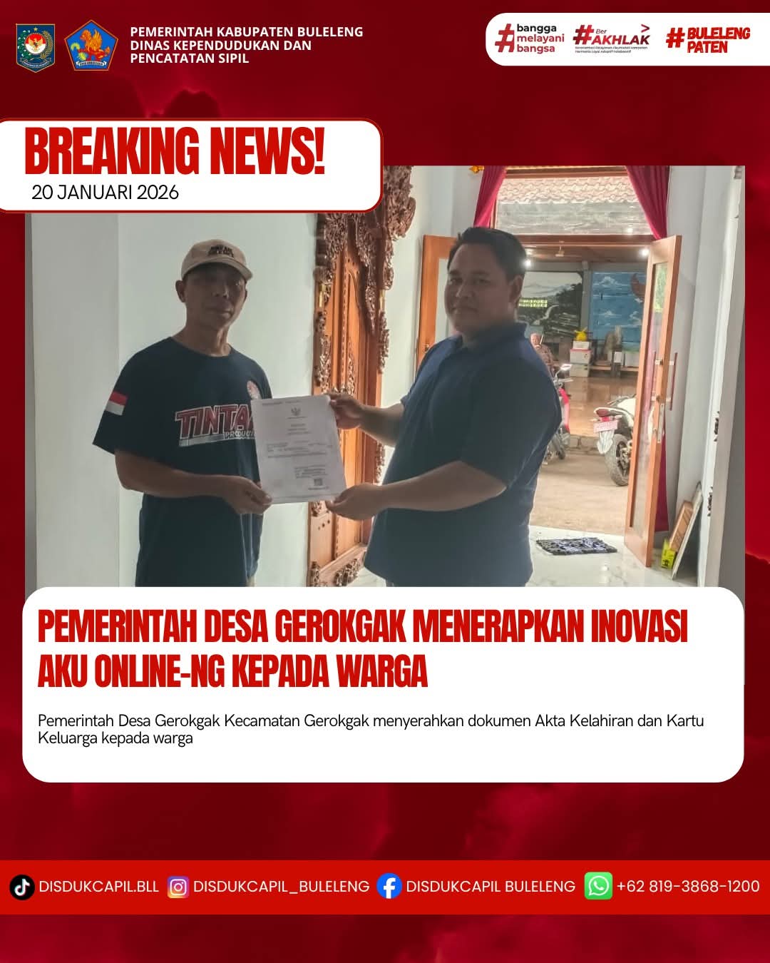 Pemerintah Kabupaten Buleleng melalui Dinas Kependudukan dan Pecatatan Sipil (Disdukcapil) Kabupaten Buleleng memaksimalkan serta mempermudah pelayanan kependudukan masyarakat dengan beberapa inovasi, melalui aplikasi AKU Online-NG. Dimana dalam penerapan aplikasi Aku Online-NG tersebut masyarakat tidak perlu lagi datang ke Dinas Dukcapil untuk melakukan pelayanan langsung cukup dengan datang ke Desa nanti akan dibantu oleh operator Desa masing-masing. Di Desa Gerokgak Kecamatan Gerokgak, telah diserahkan dokumen kependudukan berupa Akta Kelahiran atas nama Zona Raya Nur Shoba dan Kartu Keluarga atas nama Iman Nur Soleh warga Banjar Dinas Batuagung yang diserahkan langsung oleh Kasi Pelayanan Desa Gerokgak Kecamatan Gerokgak, Kabupaten Buleleng, Selasa (20/1).