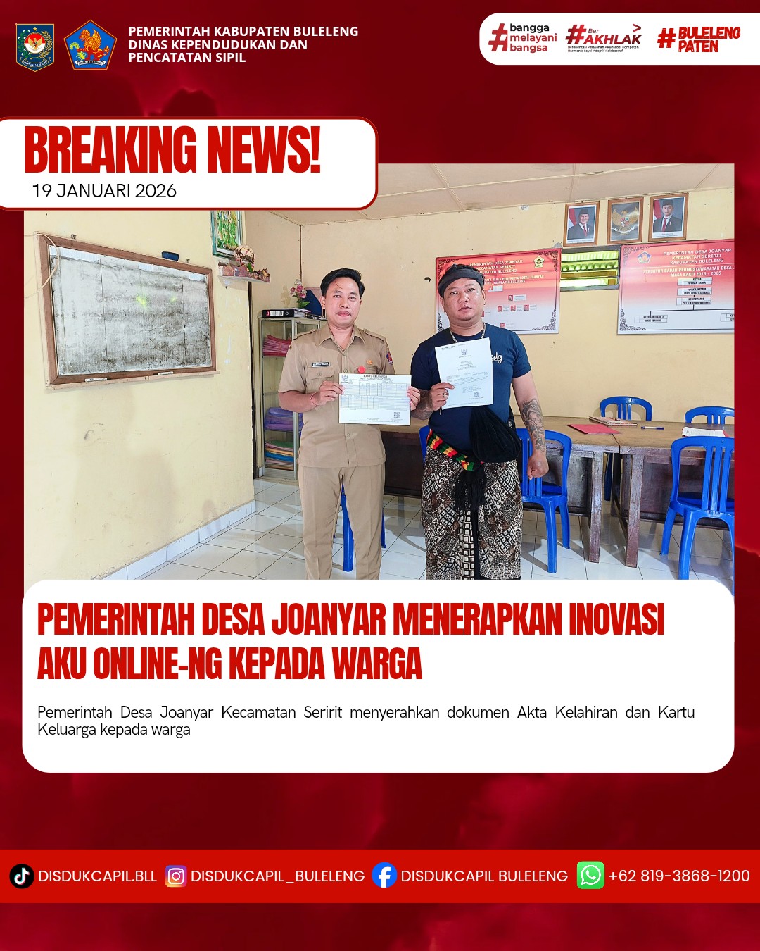 Pemerintah Kabupaten Buleleng melalui Dinas Kependudukan dan Pecatatan Sipil (Disdukcapil) Kabupaten Buleleng memaksimalkan serta mempermudah pelayanan kependudukan masyarakat dengan beberapa inovasi, melalui aplikasi AKU Online-NG. Dimana dalam penerapan aplikasi Aku Online-NG tersebut masyarakat tidak perlu lagi datang ke Dinas Dukcapil untuk melakukan pelayanan langsung cukup dengan datang ke Desa nanti akan dibantu oleh operator Desa masing-masing. Di Desa Joanyar Kecamatan Seririt, telah diserahkan dokumen kependudukan berupa Akta Kelahiran beserta Kartu Keluarga atas nama Ketut Adi Putra Wisastawan yang beralamat di Desa Joanyar yang diserahkan secara langsung oleh Kasi Pemerintahan Desa Joanyar Kecamatan Seririt, Senin (19/1).