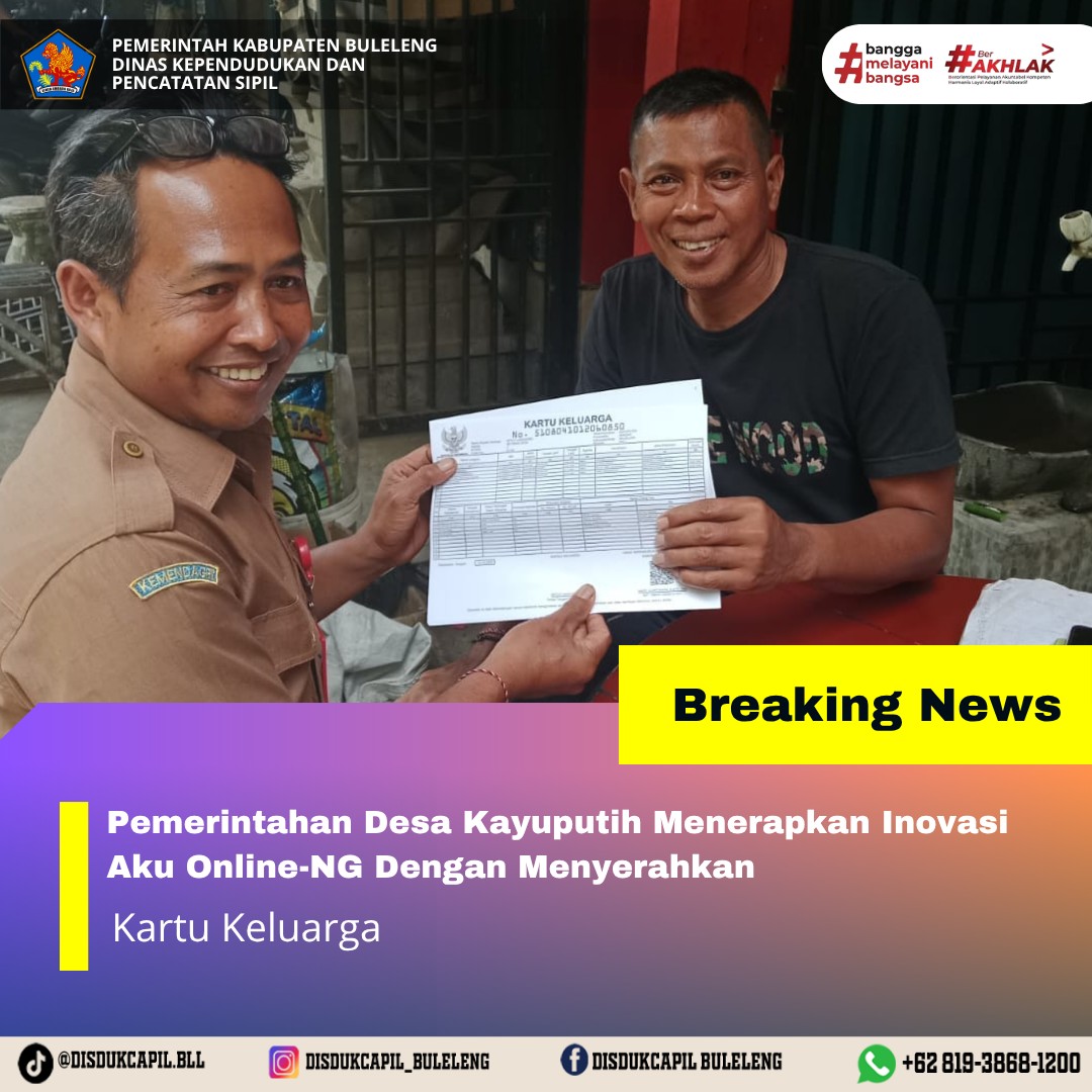 Pemerintah Kabupaten Buleleng melalui Dinas Kependudukan dan Pecatatan Sipil (Disdukcapil) Kabupaten Buleleng memaksimalkan serta mempermudah pelayanan kependudukan masyarakat dengan beberapa inovasi, melalui aplikasi AKU Online-NG. Dimana dalam penerapan aplikasi Aku Online-NG tersebut masyarakat tidak perlu lagi datang ke Dinas Dukcapil untuk melakukan pelayanan langsung cukup dengan datang ke Desa nanti akan dibantu oleh operator Desa masing-masing. Di Desa Kayuputih Kecamatan Banjar, telah diserahkan dokumen kependudukan berupa Kartu Keluarga atas nama Ketut Langgeng yang diserahkan secara langsung oleh Kelian Banjar Dinas Desa, Desa Kayuputih Kecamatan Banjar, Senin (13/10).