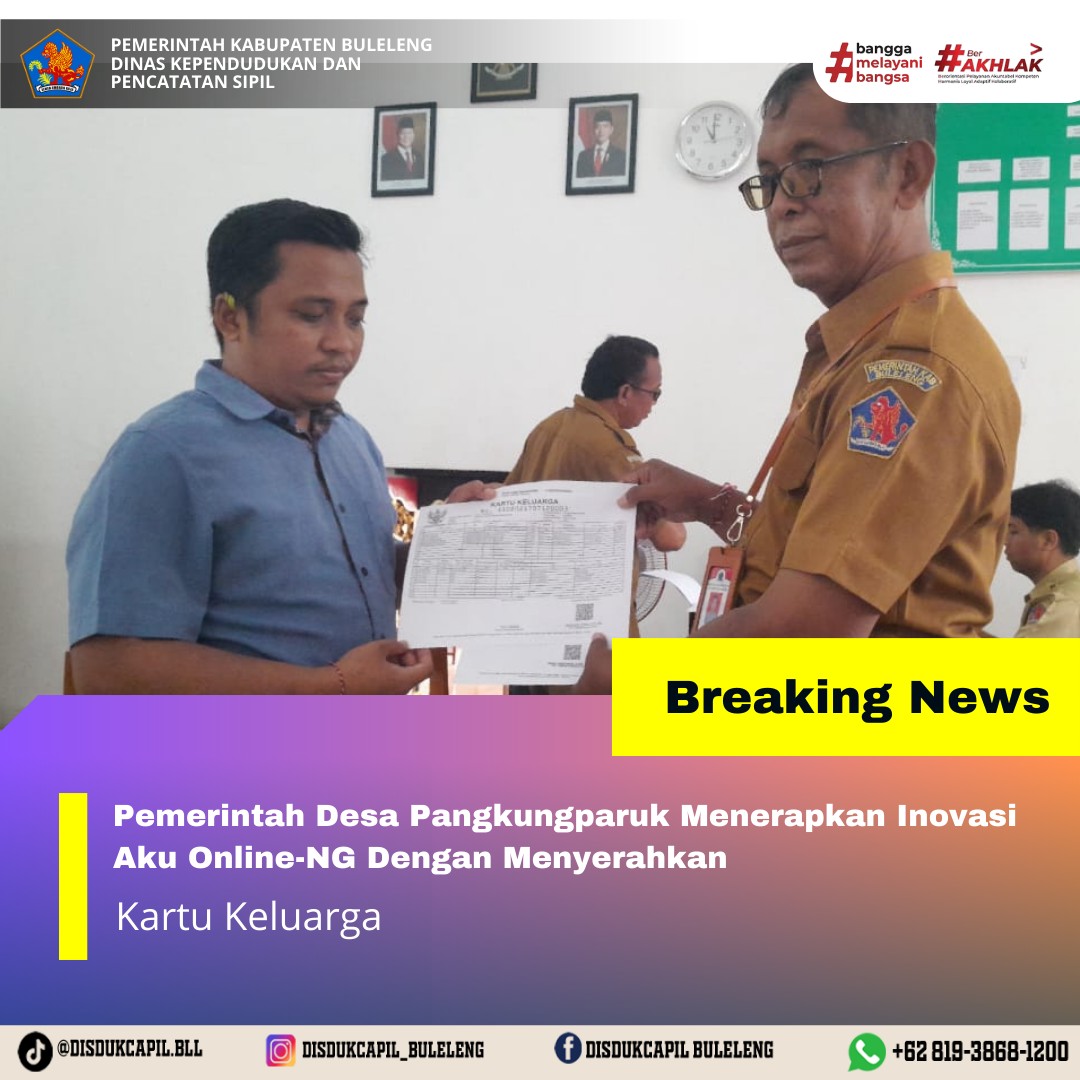 Pemerintah Kabupaten Buleleng melalui Dinas Kependudukan dan Pecatatan Sipil (Disdukcapil) Kabupaten Buleleng memaksimalkan serta mempermudah pelayanan kependudukan masyarakat dengan beberapa inovasi, melalui aplikasi AKU Online-NG. Dimana dalam penerapan aplikasi Aku Online-NG tersebut masyarakat tidak perlu lagi datang ke Dinas Dukcapil untuk melakukan pelayanan langsung cukup dengan datang ke Desa nanti akan dibantu oleh operator Desa masing-masing. Di Desa Pangkungparuk Kecamatan Seririt, telah diserahkan dokumen kependudukan berupa Kartu Keluarga atas nama Ketut Ardiasa warga Banjar Dinas Pangkungparuk Desa Pangkungparuk yang diserahkan oleh Kaur TU dan Umum Desa Pangkungparuk, Senin (8/12).