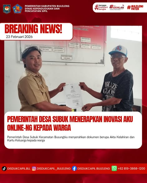 Pemerintah Kabupaten Buleleng melalui Dinas Kependudukan dan Pecatatan Sipil (Disdukcapil) Kabupaten Buleleng memaksimalkan serta mempermudah pelayanan kependudukan masyarakat dengan beberapa inovasi, melalui aplikasi AKU Online-NG. Dimana dalam penerapan aplikasi Aku Online-NG tersebut masyarakat tidak perlu lagi datang ke Dinas Dukcapil untuk melakukan pelayanan langsung cukup dengan datang ke Desa nanti akan dibantu oleh operator Desa masing-masing. Di Desa Subuk Kecamatan Busungbiu, Pemerintah Desa Subuk menyerahkan dokumen kependudukan berupa Akta Kelahiran dan Kartu Keluarga atas nama Ketut Agus Adi Saputra yang diserahkan secara lansung oleh Kasi Pemerintahan Desa Subuk Kecamatan Busungbiu, Senin (23/2).