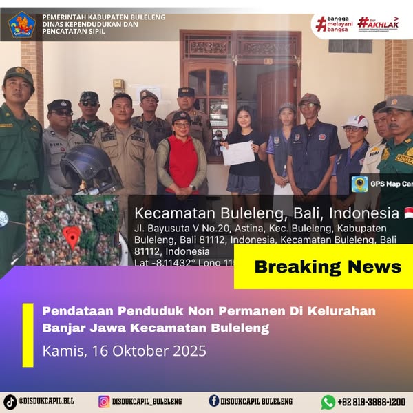 Kali ini Kamis, 16 Oktober 2025, Dinas Kependudukan dan Pencatatan Sipil Kabupaten Buleleng melaksanakan kegiatan pendataan penduduk Non Permanen di Kelurahan Banjar Jawa Kecamatan Buleleng. Dari pendataan penduduk kali ini didapatkan hasil :