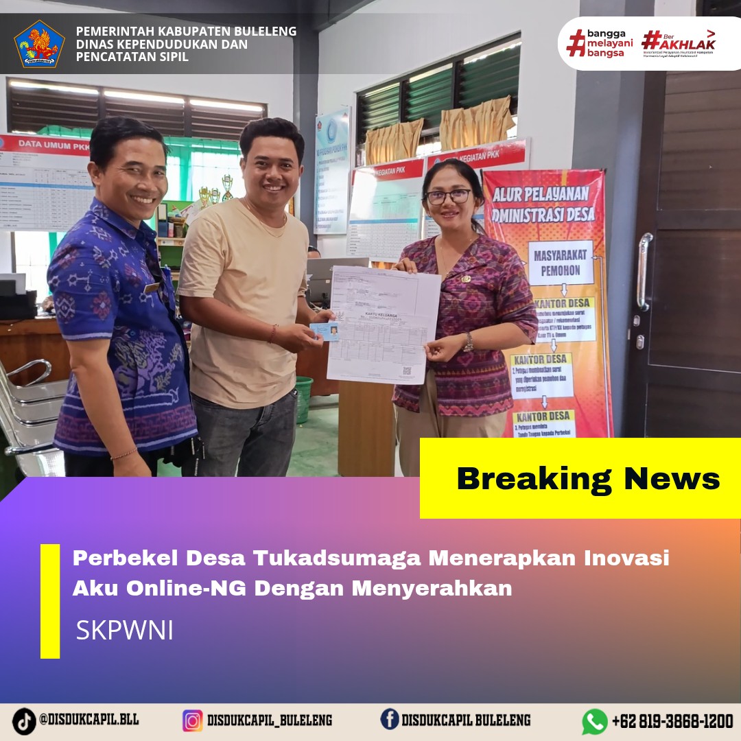 Pemerintah Kabupaten Buleleng melalui Dinas Kependudukan dan Pecatatan Sipil (Disdukcapil) Kabupaten Buleleng memaksimalkan serta mempermudah pelayanan kependudukan masyarakat dengan beberapa inovasi, melalui aplikasi AKU Online. Dimana dalam penerapan aplikasi Aku Online tersebut masyarakat tidak perlu lagi datang ke Dinas Dukcapil untuk melakukan pelayanan langsung cukup dengan datang ke Desa nanti akan dibantu oleh operator Desa masing-masing. Di Desa Tukadsumaga Kecamatan Gerokgak telah diserahkan dokumen kependudukan berupa SKPWNI dan Kartu Keluarga atas nama I Made Kasub Artana yang diserahkan oleh Perbekel Desa Tukadsumaga Kecamatan Gerokgak Anak Agung Sri Wathi didampingi Kelian Banjar Dinas Pohkembar I Nyoman Budiasa kepada warga Desa Tukadsumaga, Selasa (14/10).