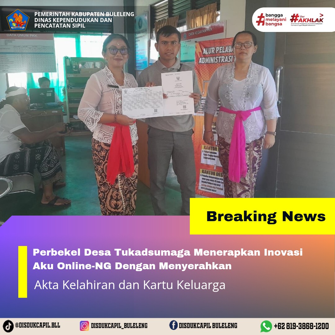 Pemerintah Kabupaten Buleleng melalui Dinas Kependudukan dan Pecatatan Sipil (Disdukcapil) Kabupaten Buleleng memaksimalkan serta mempermudah pelayanan kependudukan masyarakat dengan beberapa inovasi, melalui aplikasi AKU Online-NG. Dimana dalam penerapan aplikasi Aku Online-NG tersebut masyarakat tidak perlu lagi datang ke Dinas Dukcapil untuk melakukan pelayanan langsung cukup dengan datang ke Desa nanti akan dibantu oleh operator Desa masing-masing. Di Desa Tukadsumaga Kecamatan Gerokgak, telah diserahkan dokumen kependudukan berupa Akta Kelahiran dan Kartu Keluarga atas nama I Kadek Suartawan yang diserahkan oleh Perbekel Desa Tukadsumaga Anak Agung Sri Wathi didampingi oleh kasi pemerintahan Made Budisri Adnyani di Kantor Perbekel Desa Tukadsumaga, Jumat (8/8).