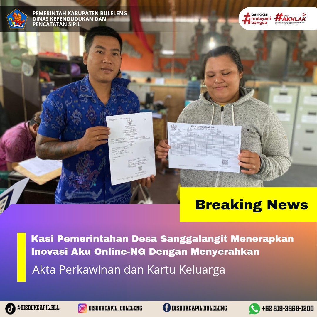 Pemerintah Kabupaten Buleleng melalui Dinas Kependudukan dan Pecatatan Sipil (Disdukcapil) Kabupaten Buleleng memaksimalkan serta mempermudah pelayanan kependudukan masyarakat dengan beberapa inovasi, melalui aplikasi AKU Online. Dimana dalam penerapan aplikasi Aku Online tersebut masyarakat tidak perlu lagi datang ke Dinas Dukcapil untuk melakukan pelayanan langsung cukup dengan datang ke Desa nanti akan dibantu oleh operator Desa masing-masing. Di Desa Sanggalangit Kecamatan Gerokgak telah diserahkan dokumen kependudukan berupa Akta Perkawinan dan Kartu Keluarga atas nama I Ketut Suwardana warga Banjar Dinas Wanasari yang diserahkan oleh Kasi Pemerintahan Desa Sanggalangit Kecamatan Gerokgak, Selasa (30/9).