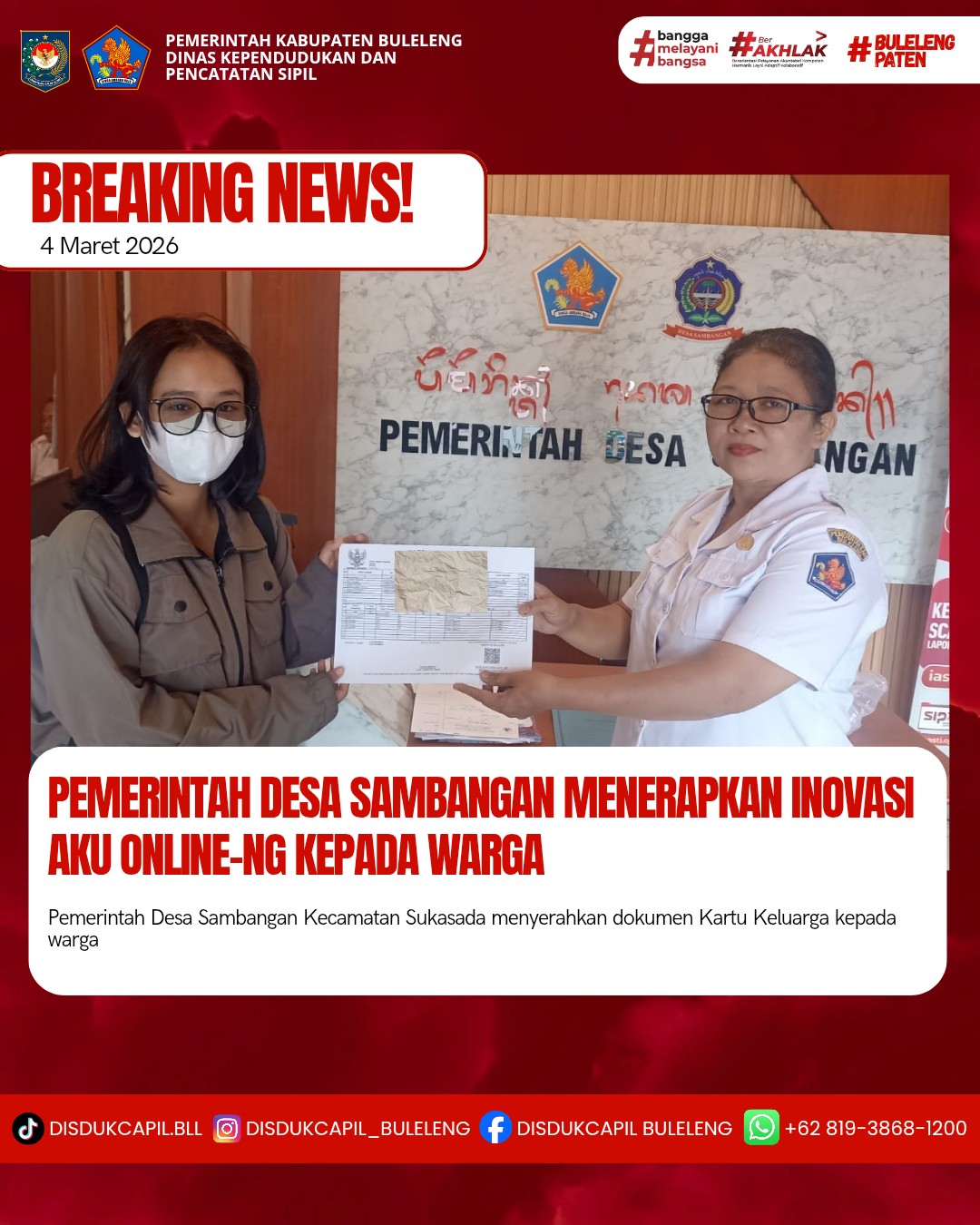 Pemerintah Kabupaten Buleleng melalui Dinas Kependudukan dan Pecatatan Sipil (Disdukcapil) Kabupaten Buleleng memaksimalkan serta mempermudah pelayanan kependudukan masyarakat dengan beberapa inovasi, melalui aplikasi AKU Online-NG. Dimana dalam penerapan aplikasi Aku Online-NG tersebut masyarakat tidak perlu lagi datang ke Dinas Dukcapil untuk melakukan pelayanan langsung cukup dengan datang ke Desa nanti akan dibantu oleh operator Desa masing-masing. Di Desa Sambangan Kecamatan Sukasada, telah diserahkan dokumen kependudukan berupa Kartu Keluarga atas nama Taofik Widayat diserahkan oleh Kasi Pemerintahan Desa Sambangan bertempat di Kantor Perbekel Desa Sambangan, Kecamatan Sukasada, Kabupaten Buleleng, Rabu (4/3).
