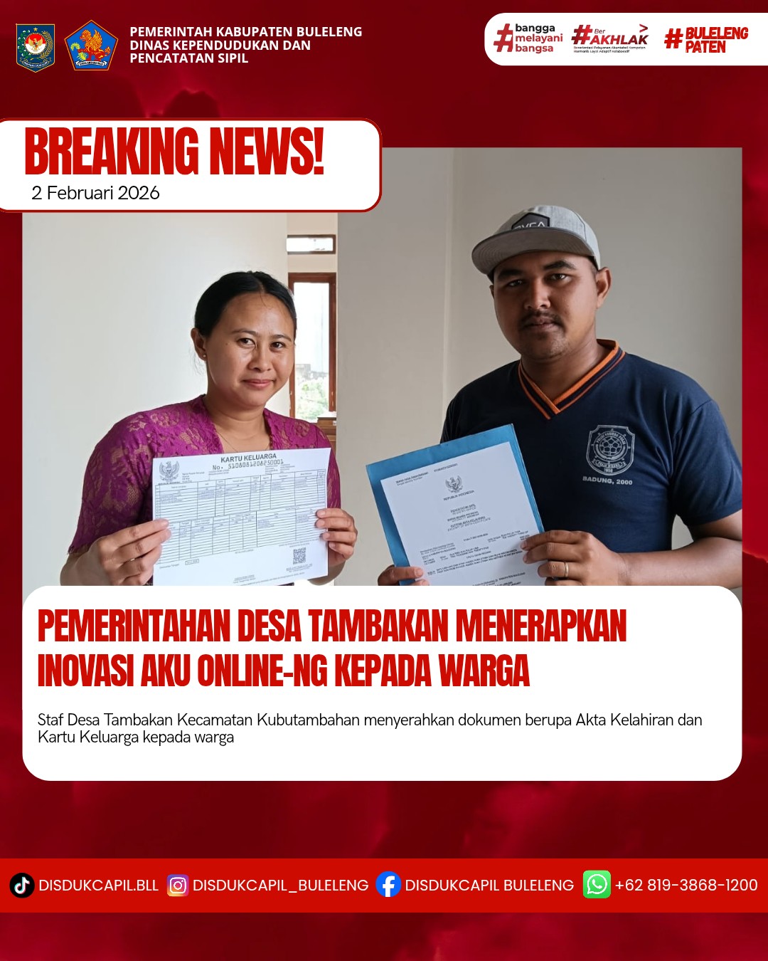 Pemerintah Kabupaten Buleleng melalui Dinas Kependudukan dan Pecatatan Sipil (Disdukcapil) Kabupaten Buleleng memaksimalkan serta mempermudah pelayanan kependudukan masyarakat dengan beberapa inovasi, melalui aplikasi AKU Online-NG. Dimana dalam penerapan aplikasi Aku Online-NG tersebut masyarakat tidak perlu lagi datang ke Dinas Dukcapil untuk melakukan pelayanan langsung cukup dengan datang ke Desa nanti akan dibantu oleh operator Desa masing-masing. Di Desa Tambakan Kecamatan Kubutambahan, telah diserahkan dokumen kependudukan berupa Akta Kelahiran atas nama I PUTU GAVIN REDANA dan Kartu Keluarga atas nama I KADEK ROMI UTAMA yang diserahkan secara langsung oleh Staf Desa Tambakan Kecamatan Kubutambahan kepada warga di Desa Tambakan Kecamatan Kubutambahan ,Kabupaten Buleleng, Senin (2/2).