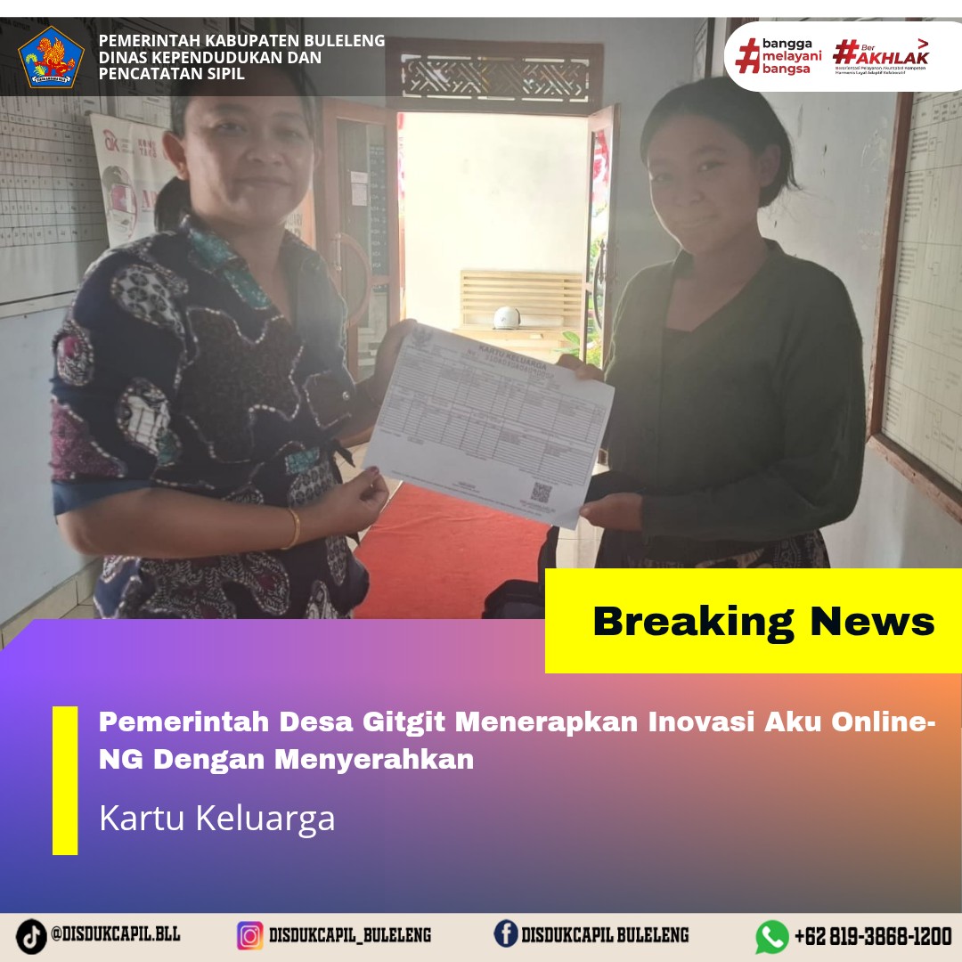 Pemerintah Kabupaten Buleleng melalui Dinas Kependudukan dan Pecatatan Sipil (Disdukcapil) Kabupaten Buleleng memaksimalkan serta mempermudah pelayanan kependudukan masyarakat dengan beberapa inovasi, melalui aplikasi AKU Online-NG. Dimana dalam penerapan aplikasi Aku Online-NG tersebut masyarakat tidak perlu lagi datang ke Dinas Dukcapil untuk melakukan pelayanan langsung cukup dengan datang ke Desa nanti akan dibantu oleh operator Desa masing-masing. Di Desa Gitgit Kecamatan Sukasada, telah diserahkan dokumen kependudukan berupa Kartu Keluarga atas nama Kadek Widani yang diserahkan oleh Pemerintahan Desa Gitgit kepada warga bertempat di Kantor Perbekel Desa Gitgit, Kecamatan Sukasada, Kabupaten Buleleng, Kamis (27/11).