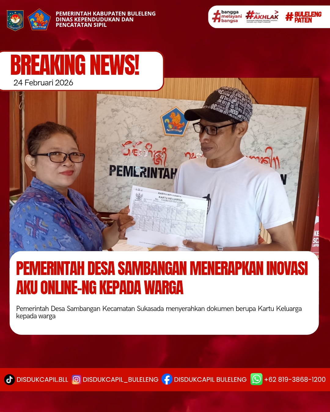 Pemerintah Kabupaten Buleleng melalui Dinas Kependudukan dan Pecatatan Sipil (Disdukcapil) Kabupaten Buleleng memaksimalkan serta mempermudah pelayanan kependudukan masyarakat dengan beberapa inovasi, melalui aplikasi AKU Online-NG. Dimana dalam penerapan aplikasi Aku Online-NG tersebut masyarakat tidak perlu lagi datang ke Dinas Dukcapil untuk melakukan pelayanan langsung cukup dengan datang ke Desa nanti akan dibantu oleh operator Desa masing-masing. Di Desa Sambangan Kecamatan Sukasada, telah diserahkan dokumen kependudukan berupa Kartu Keluarga atas nama Made Juwita dan Nyoman Payas diserahkan oleh Kasi Pemerintahan Desa Sambangan bertempat di Kantor Perbekel Desa Sambangan, Kecamatan Sukasada, Kabupaten Buleleng, Selasa (24/2).