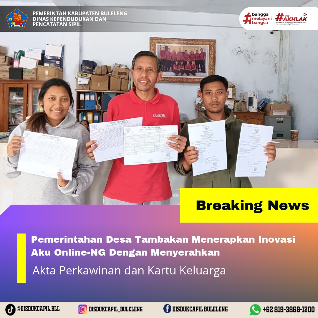 Pemerintah Kabupaten Buleleng melalui Dinas Kependudukan dan Pecatatan Sipil (Disdukcapil) Kabupaten Buleleng memaksimalkan serta mempermudah pelayanan kependudukan masyarakat dengan beberapa inovasi, melalui aplikasi AKU Online-NG. Dimana dalam penerapan aplikasi Aku Online-NG tersebut masyarakat tidak perlu lagi datang ke Dinas Dukcapil untuk melakukan pelayanan langsung cukup dengan datang ke Desa nanti akan dibantu oleh operator Desa masing-masing. Di Desa Tambakan Kecamatan Kubutambahan, telah diserahkan dokumen kependudukan berupa Akta Perkawinan dan Kartu Keluarga atas nama KADEK ASRAWAN yang diserahkan secara langsung oleh Staf Desa Tambakan Kecamatan Kubutambahan, Jumat (3/10).