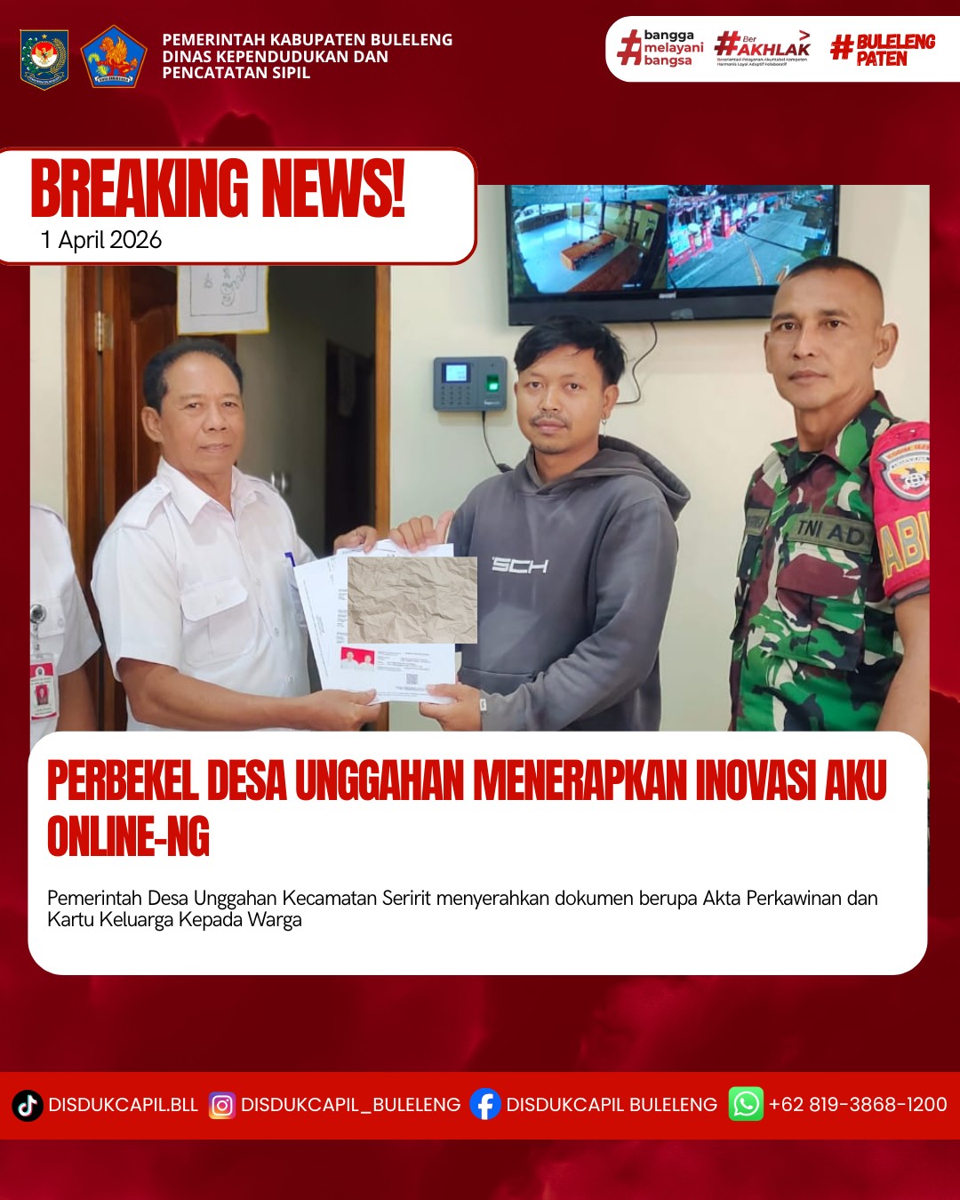 Pemerintah Kabupaten Buleleng melalui Dinas Kependudukan dan Pecatatan Sipil (Disdukcapil) Kabupaten Buleleng memaksimalkan serta mempermudah pelayanan kependudukan masyarakat dengan beberapa inovasi, melalui aplikasi AKU Online-NG. Dimana dalam penerapan aplikasi Aku Online-NG tersebut masyarakat tidak perlu lagi datang ke Dinas Dukcapil untuk melakukan pelayanan langsung, cukup dengan datang ke Desa nanti akan dibantu oleh operator Desa masing-masing. Di Desa Unggahan Kecamatan Seririt, telah diserahkan dokumen kependudukan berupa Akta Perkawinan dan Kartu Keluarga atas nama Gede Widyantara yang diserahkan oleh Perbekel Desa Unggahan I KETUT NASA kepada warga yang bertempat di Kantor Perbekel Desa Unggahan, Kecamatan Seririt, Kabupaten Buleleng, Rabu (1/4).