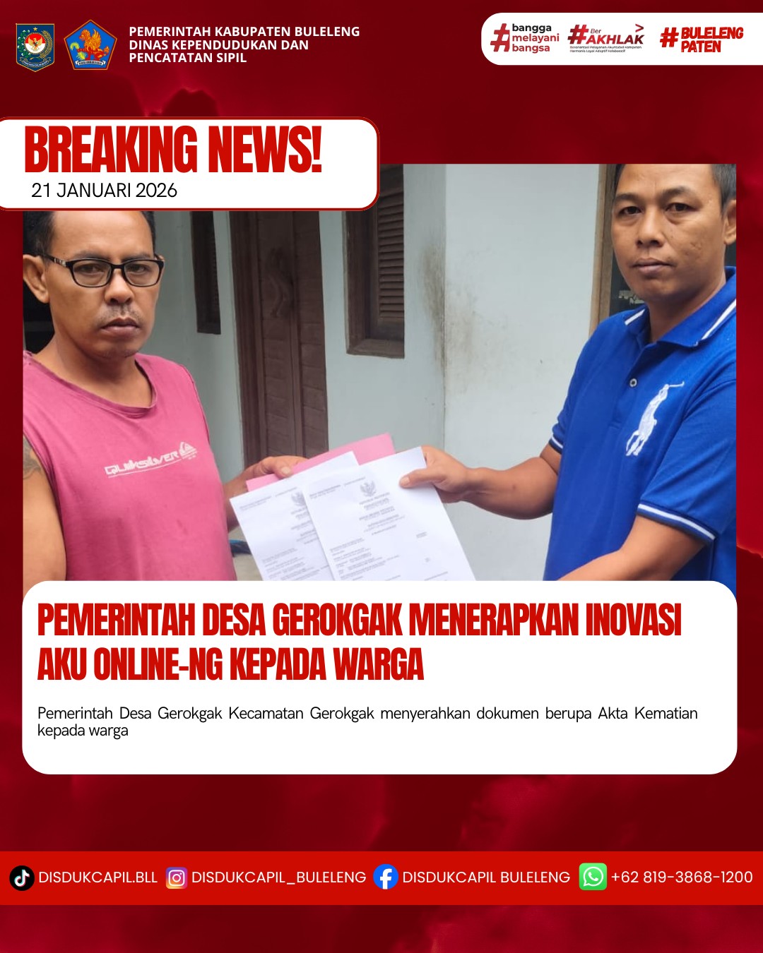 Pemerintah Kabupaten Buleleng melalui Dinas Kependudukan dan Pecatatan Sipil (Disdukcapil) Kabupaten Buleleng memaksimalkan serta mempermudah pelayanan kependudukan masyarakat dengan beberapa inovasi, melalui aplikasi AKU Online-NG. Dimana dalam penerapan aplikasi Aku Online-NG tersebut masyarakat tidak perlu lagi datang ke Dinas Dukcapil untuk melakukan pelayanan langsung cukup dengan datang ke Desa nanti akan dibantu oleh operator Desa masing-masing. Di Desa Gerokgak Kecamatan Gerokgak, telah diserahkan dokumen kependudukan berupa Akta Kematian atas nama Ketut Sarki dan Nyoman Kasih warga Banjar Dinas Pikada Batuangung Pidada yang diserahkan langsung oleh Kelian Banjar Dinas Pikada Batuangung Pidada Desa Gerokgak Kecamatan Gerokgak, Kabupaten Buleleng, Rabu (21/1).