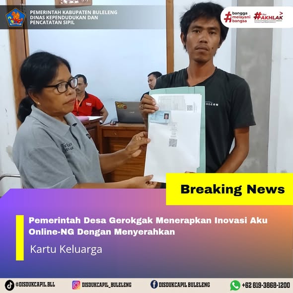 Pemerintah Kabupaten Buleleng melalui Dinas Kependudukan dan Pecatatan Sipil (Disdukcapil) Kabupaten Buleleng memaksimalkan serta mempermudah pelayanan kependudukan masyarakat dengan beberapa inovasi, melalui aplikasi AKU Online. Dimana dalam penerapan aplikasi Aku Online tersebut masyarakat tidak perlu lagi datang ke Dinas Dukcapil untuk melakukan pelayanan langsung cukup dengan datang ke Desa nanti akan dibantu oleh operator Desa masing-masing. Di Desa Gerokgak Kecamatan Gerokgak telah diserahkan dokumen kependudukan berupa Kartu Keluarga atas nama Kadek Erik Juliawan yang diserahkan langsung oleh Kasi pemerintahan Desa Gerokgak, Kecamatan Gerokgak, Kamis (7/11).