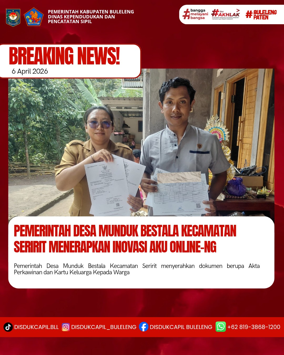 Pemerintah Kabupaten Buleleng melalui Dinas Kependudukan dan Pecatatan Sipil (Disdukcapil) Kabupaten Buleleng memaksimalkan serta mempermudah pelayanan kependudukan masyarakat dengan beberapa inovasi, melalui aplikasi AKU Online. Dimana dalam penerapan aplikasi Aku Online tersebut masyarakat tidak perlu lagi datang ke Dinas Dukcapil untuk melakukan pelayanan langsung cukup dengan datang ke Desa nanti akan dibantu oleh operator Desa masing-masing. Di Desa Munduk Bestala Kecamatan Seririt telah diserahkan dokumen kependudukan berupa Akta Perkawinan dan Kartu Keluarga kepada warga oleh Kelian Banjar Dinas Sekar, Desa Munduk Bestala, Kecamatan Seririt , Senin (6/4).