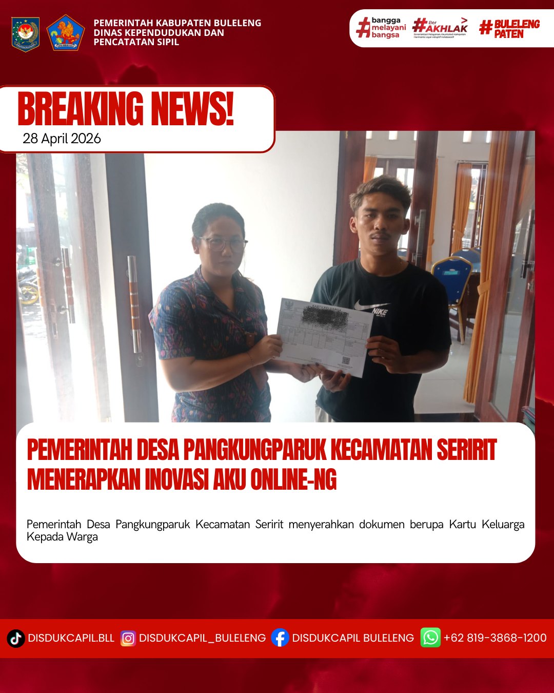 Pemerintah Kabupaten Buleleng melalui Dinas Kependudukan dan Pecatatan Sipil (Disdukcapil) Kabupaten Buleleng memaksimalkan serta mempermudah pelayanan kependudukan masyarakat dengan beberapa inovasi, melalui aplikasi AKU Online-NG. Dimana dalam penerapan aplikasi Aku Online-NG tersebut masyarakat tidak perlu lagi datang ke Dinas Dukcapil untuk melakukan pelayanan langsung, cukup dengan datang ke Desa nanti akan dibantu oleh operator Desa masing-masing. Di Desa Pangkungparuk Kecamatan Seririt, telah diserahkan dokumen kependudukan berupa Kartu Keluarga dan Akta Kelahiran An. Putu Indra Seputra warga Banjar Dinas Laba Nangga, Desa Pangkungparuk yang diserahkan oleh Operator Desa Pangkungparuk, Selasa (28 /4)