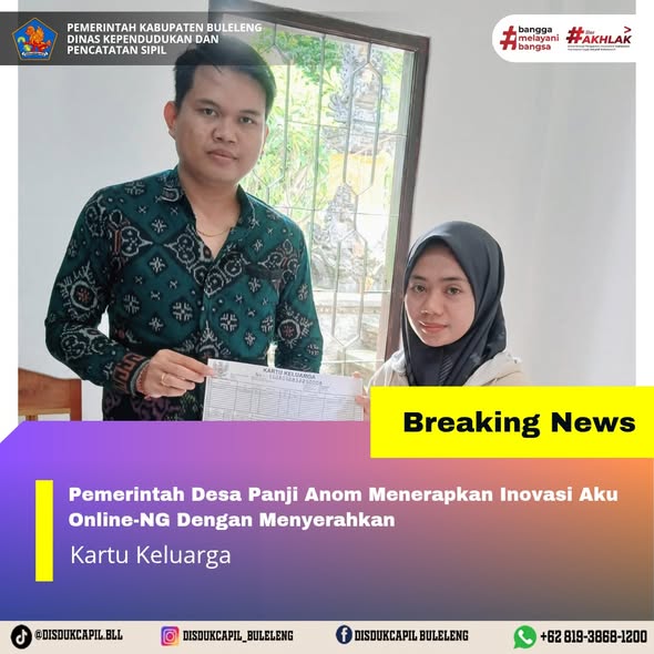 Pemerintah Kabupaten Buleleng melalui Dinas Kependudukan dan Pecatatan Sipil (Disdukcapil) Kabupaten Buleleng memaksimalkan serta mempermudah pelayanan kependudukan masyarakat dengan beberapa inovasi, melalui aplikasi AKU Online-NG. Dimana dalam penerapan aplikasi Aku Online-NG tersebut masyarakat tidak perlu lagi datang ke Dinas Dukcapil untuk melakukan pelayanan langsung cukup dengan datang ke Desa nanti akan dibantu oleh operator Desa masing-masing. Di Desa Panji Anom Kecamatan Sukasada, telah diserahkan dokumen kependudukan berupa Kartu Keluarga atas nama NINING FADHILAH yang diserahkan langsung oleh Kasi Pemerintahan Desa Panji Anom bertempat di Kantor Perbekel Panji Anom, Kecamatan Sukasada, Selasa (9/12).