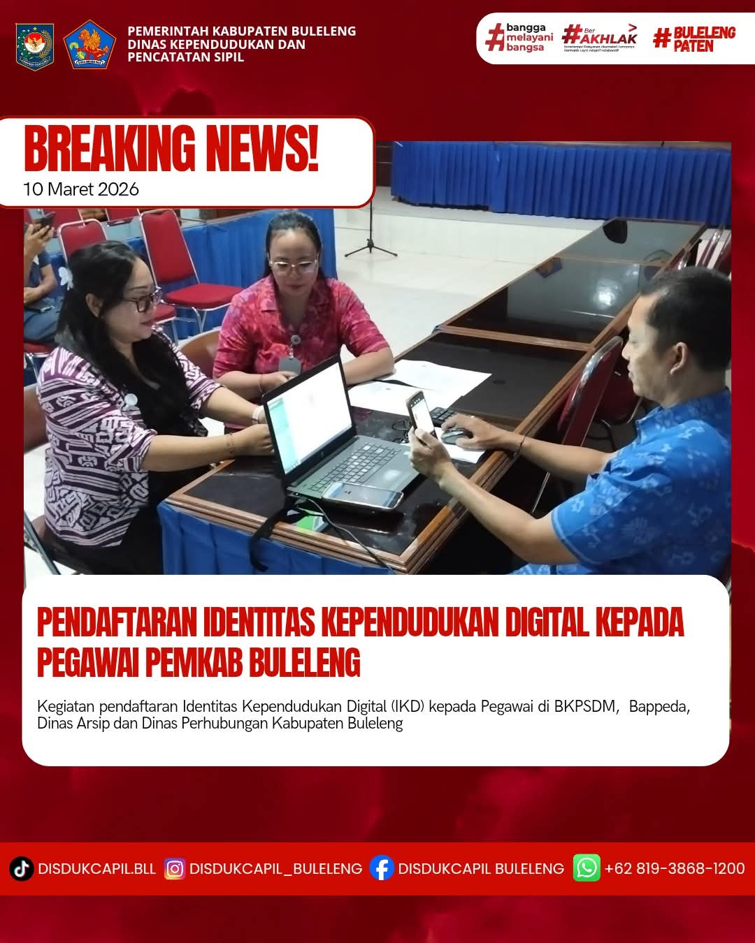Menerapkan aturan pemerintah tersebut, Dinas Kependudukan dan Pencatatan Sipil Kabupaten Buleleng menyelenggarakan Pendaftaran Identitas Kependudukan Digital ke sekolah-sekolah, Dinas, Lembaga dan Perusahaan secara bergilir setiap harinya. Kali ini pelaksanaan pendaftaran Identitas Kependudukan Digital kepada Pegawai yang dilaksanakan di 4 OPD yaitu BKPSDM, Bappeda, DAPD dan Dinas Perhubungan Kabupaten Buleleng, Selasa (10/3).