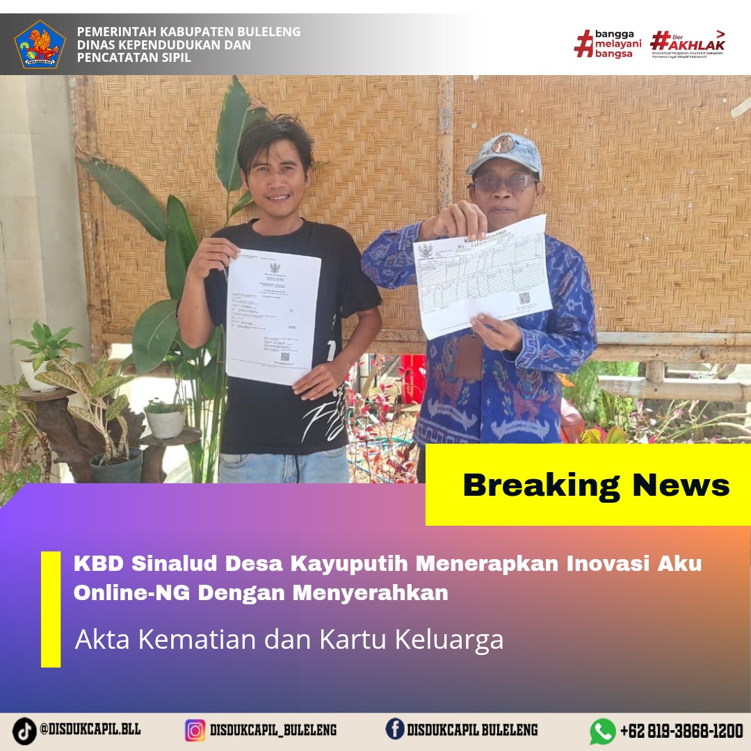 Pemerintah Kabupaten Buleleng melalui Dinas Kependudukan dan Pecatatan Sipil (Disdukcapil) Kabupaten Buleleng memaksimalkan serta mempermudah pelayanan kependudukan masyarakat dengan beberapa inovasi, melalui aplikasi AKU Online-NG. Dimana dalam penerapan aplikasi Aku Online-NG tersebut masyarakat tidak perlu lagi datang ke Dinas Dukcapil untuk melakukan pelayanan langsung cukup dengan datang ke Desa nanti akan dibantu oleh operator Desa masing-masing. Di Desa Kayuputih Kecamatan Sukasada, telah diserahkan dokumen kependudukan berupa Akta Kematian atas nama Ketut Mustari dan Kartu Keluarga atas nama Ketut Suradarma warga Banjar Dinas Sinalud, Desa Kayu Putih, Kecamatan Sukasada yang diserahkan secara langsung oleh Kelian Banjar Dinas Sinalud, Desa Kayuputih Kecamatan Sukasada, Selasa (23/12).