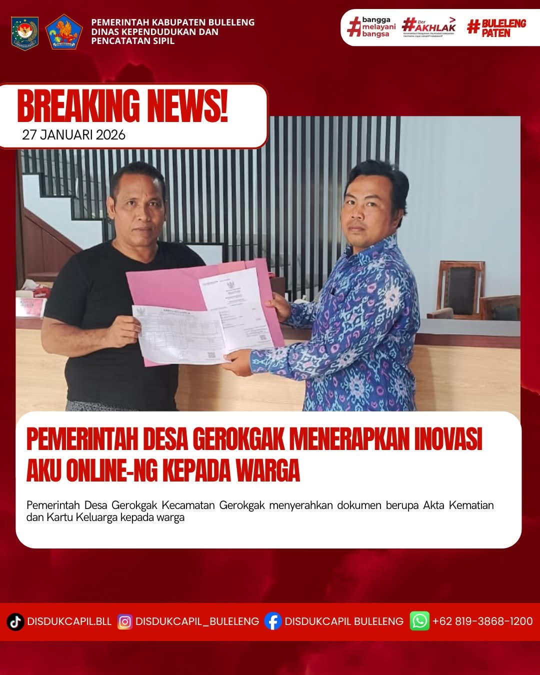 Pemerintah Kabupaten Buleleng melalui Dinas Kependudukan dan Pecatatan Sipil (Disdukcapil) Kabupaten Buleleng memaksimalkan serta mempermudah pelayanan kependudukan masyarakat dengan beberapa inovasi, melalui aplikasi AKU Online-NG. Dimana dalam penerapan aplikasi Aku Online-NG tersebut masyarakat tidak perlu lagi datang ke Dinas Dukcapil untuk melakukan pelayanan langsung cukup dengan datang ke Desa nanti akan dibantu oleh operator Desa masing-masing. Di Desa Gerokgak Kecamatan Gerokgak, telah diserahkan dokumen kependudukan berupa Akta Kematian atas nama Luh Marini dan Kartu Keluarga atas nama Komang Suparta yang diserahkan langsung oleh Kelian Banjar Dinas Palbesi Desa Gerokgak Kecamatan Gerokgak, Kabupaten Buleleng, Selasa (27/1).