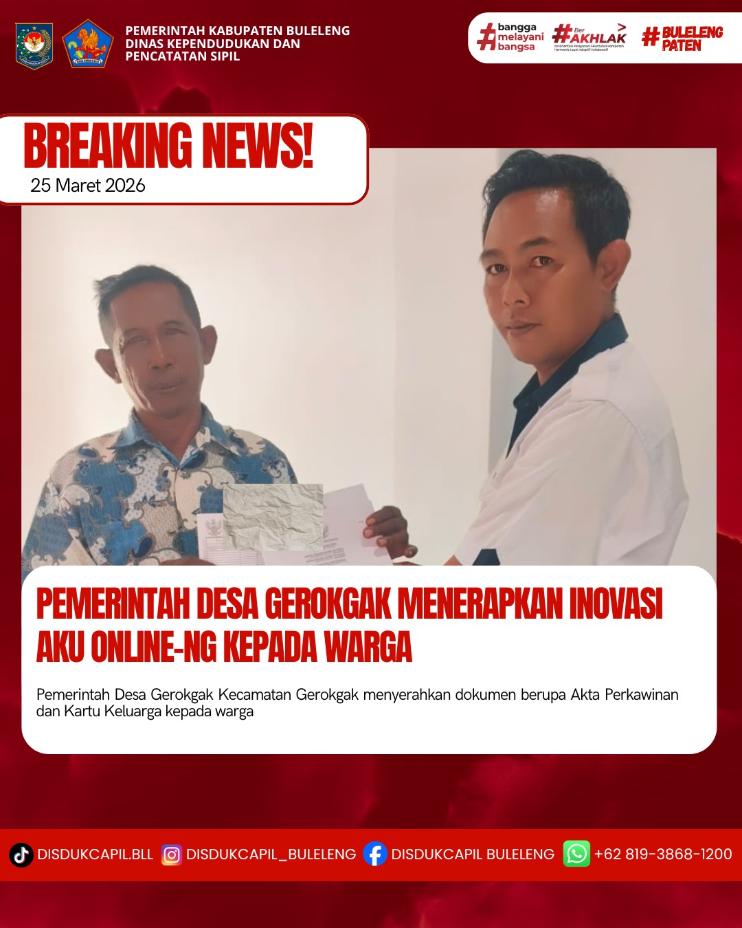 Pemerintah Kabupaten Buleleng melalui Dinas Kependudukan dan Pecatatan Sipil (Disdukcapil) Kabupaten Buleleng memaksimalkan serta mempermudah pelayanan kependudukan masyarakat dengan beberapa inovasi, melalui aplikasi AKU Online-NG. Dimana dalam penerapan aplikasi Aku Online-NG tersebut masyarakat tidak perlu lagi datang ke Dinas Dukcapil untuk melakukan pelayanan langsung cukup dengan datang ke Desa nanti akan dibantu oleh operator Desa masing-masing. Di Desa Gerokgak Kecamatan Gerokgak, telah diserahkan dokumen kependudukan berupa Akta Perkawinan dan Kartu Keluarga atas nama Kadek Juli Ariawan dan Kartu Keluarga atas nama Kadek Mertayasa yang diserahkan langsung oleh Kelian Banjar Dinas Batuagung Pidada Desa Gerokgak di Desa Gerokgak, Kecamatan Gerokgak, Kabupaten Buleleng, Rabu (25/3).