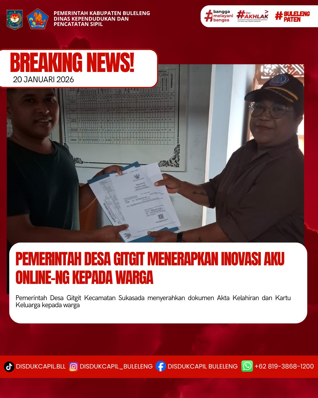 Pemerintah Kabupaten Buleleng melalui Dinas Kependudukan dan Pecatatan Sipil (Disdukcapil) Kabupaten Buleleng memaksimalkan serta mempermudah pelayanan kependudukan masyarakat dengan beberapa inovasi, melalui aplikasi AKU Online-NG. Dimana dalam penerapan aplikasi Aku Online-NG tersebut masyarakat tidak perlu lagi datang ke Dinas Dukcapil untuk melakukan pelayanan langsung cukup dengan datang ke Desa nanti akan dibantu oleh operator Desa masing-masing. Di Desa Gitgit Kecamatan Sukasada, telah diserahkan dokumen kependudukan berupa Akta Kelahiran dan Kartu Keluarga atas nama Kadek Dinda Amelia yang diserahkan secara langsung oleh Kelian Banjar Dinas Desa Gitgit Kecamatan Sukasada kepada warga di Desa Gitgit Kecamatan Sukasada, Kabupaten Buleleng, Selasa (20/1).