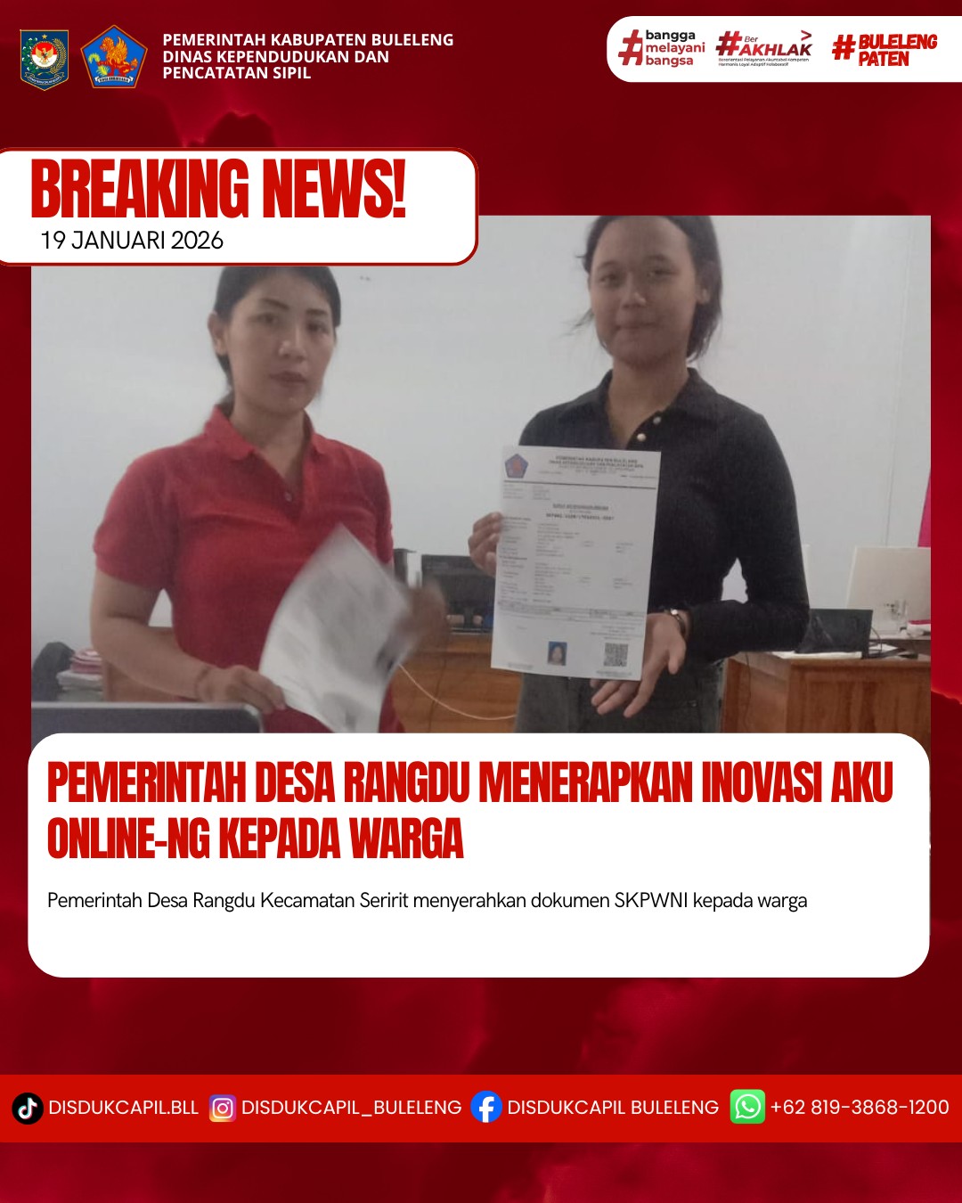 Pemerintah Kabupaten Buleleng melalui Dinas Kependudukan dan Pecatatan Sipil (Disdukcapil) Kabupaten Buleleng memaksimalkan serta mempermudah pelayanan kependudukan masyarakat dengan beberapa inovasi, melalui aplikasi AKU Online. Dimana dalam penerapan aplikasi Aku Online tersebut masyarakat tidak perlu lagi datang ke Dinas Dukcapil untuk melakukan pelayanan langsung cukup dengan datang ke Desa nanti akan dibantu oleh operator Desa masing-masing. Di Desa Rangdu Kecamatan Seririt telah diserahkan dokumen kependudukan berupa SKPWNI antar Provinsi atas nama Luh Putu Lusiana Dewi dan Kartu Keluarga atas nama Ketut Suarjana di serahkan langsung oleh Operator Desa Rangdu Kecamatan Seririt, Senin (19/1).
