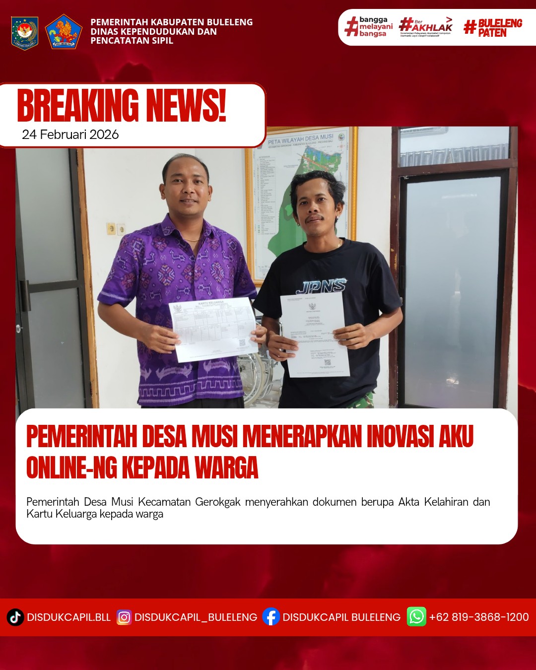Pemerintah Kabupaten Buleleng melalui Dinas Kependudukan dan Pecatatan Sipil (Disdukcapil) Kabupaten Buleleng memaksimalkan serta mempermudah pelayanan kependudukan masyarakat dengan beberapa inovasi, melalui aplikasi AKU Online-NG. Dimana dalam penerapan aplikasi Aku Online-NG tersebut masyarakat tidak perlu lagi datang ke Dinas Dukcapil untuk melakukan pelayanan langsung cukup dengan datang ke Desa nanti akan dibantu oleh operator Desa masing-masing. Di Desa Musi Kecamatan Gerokgak, telah diserahkan dokumen kependudukan berupa Akta Kelahiran dan Kartu Keluarga yang diserahkan langsung oleh Kasi Pemerintahan Desa Musi Kecamatan Gerokgak, Kabupaten Buleleng, Selasa (24/2).