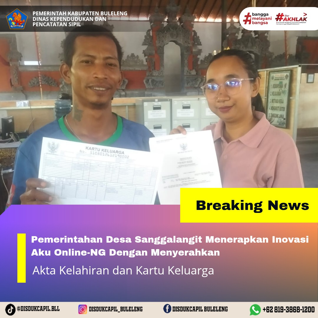 Pemerintah Kabupaten Buleleng melalui Dinas Kependudukan dan Pecatatan Sipil (Disdukcapil) Kabupaten Buleleng memaksimalkan serta mempermudah pelayanan kependudukan masyarakat dengan beberapa inovasi, melalui aplikasi AKU Online. Dimana dalam penerapan aplikasi Aku Online tersebut masyarakat tidak perlu lagi datang ke Dinas Dukcapil untuk melakukan pelayanan langsung cukup dengan datang ke Desa nanti akan dibantu oleh operator Desa masing-masing. Di Desa Sanggalangit Kecamatan Gerokgak telah diserahkan dokumen kependudukan berupa Akta Kelahiran dan Kartu Keluarga kepada warga atas nama GEDE AGUS ARDHI DARMAWAN di Banjar Dinas Tukadpule Desa Sanggalangit oleh Pemerintahan Desa Sanggalangit Kecamatan Gerokgak, Jumat (26/9).