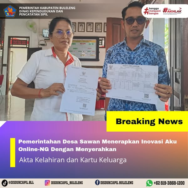Pemerintah Kabupaten Buleleng melalui Dinas Kependudukan dan Pecatatan Sipil (Disdukcapil) Kabupaten Buleleng memaksimalkan serta mempermudah pelayanan kependudukan masyarakat dengan beberapa inovasi, melalui aplikasi AKU Online-NG. Dimana dalam penerapan aplikasi Aku Online-NG tersebut masyarakat tidak perlu lagi datang ke Dinas Dukcapil untuk melakukan pelayanan langsung cukup dengan datang ke Desa nanti akan dibantu oleh operator Desa masing-masing. Di Desa Sawan Kecamatan Sawan, telah diserahkan dokumen kependudukan berupa Akta Kelahiran dan Kartu Keluarga atas nama Ida Ayu Komang Lavanya Anasera yang diserahkan langsung oleh Kaur Umum Desa Sawan atas nama Made Pancayasa bertempat di kantor Perbekel Desa Sawan, Kecamatan Sawan, Kabupaten Buleleng, Rabu (17/9).