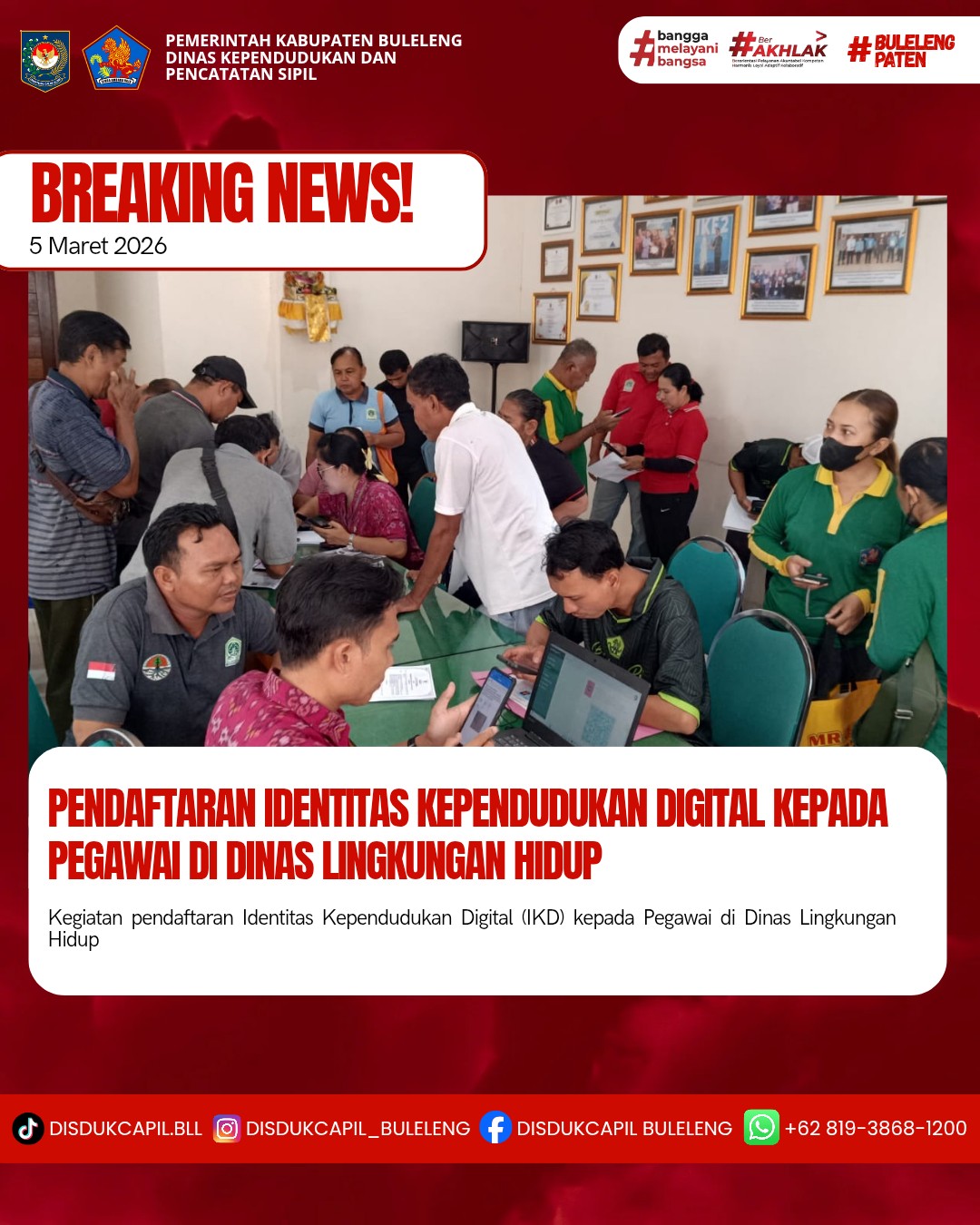 Menerapkan aturan pemerintah tersebut, Dinas Kependudukan dan Pencatatan Sipil Kabupaten Buleleng menyelenggarakan Pendaftaran Identitas Kependudukan Digital ke sekolah-sekolah, Dinas, Lembaga dan Perusahaan secara bergilir setiap harinya. Kali ini pelaksanaan pendaftaran Identitas Kependudukan Digital kepada Pegawai yang dilaksanakan di Dinas Lingkungan Hidup, Kamis (5/3).