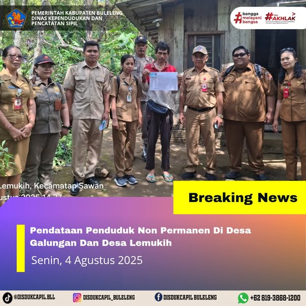 Kali ini Senin, 4 Agustus 2025, Dinas Kependudukan dan Pencatatan Sipil Kabupaten Buleleng melaksanakan kegiatan pendataan penduduk Non Permanen di Desa Galungan dan Desa Lemukih Kecamatan Sawan. Dari pendataan penduduk kali ini didapatkan hasil :
