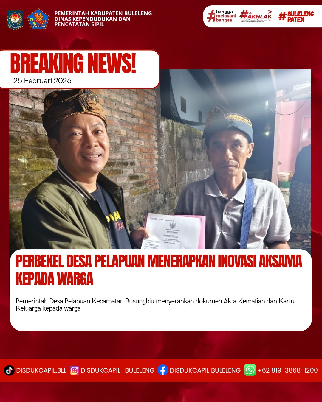 Pemerintah Kabupaten Buleleng melalui Dinas Kependudukan dan Pecatatan Sipil (Disdukcapil) Kabupaten Buleleng memaksimalkan serta mempermudah pelayanan kependudukan masyarakat dengan beberapa inovasi, yakni BALITA (Bayi Lahir Berakta), NYAKSI (Menyerahkan Akta Kawin Saat Acara Perkawinan) dan AKSAMA ( Akta Kematian Diserahkan Saat Masih Berduka) melalui aplikasi Aku Online. Di Desa Pelapuan Kecamatan Busungbiu, telah diterapkan program Aksama (Akta Kematian Diserahkan Saat Masih Berduka) yang dilakukan secara langsung oleh Perbekel Desa Pelapuan Gede Agus Armika Yasa dengan menyerahkan Akta Kematian atas nama Made Kastima dan Kartu Keluarga kepada keluarga almarhum di Desa Pelapuan Kecamatan Busungbiu, Rabu (25/2).