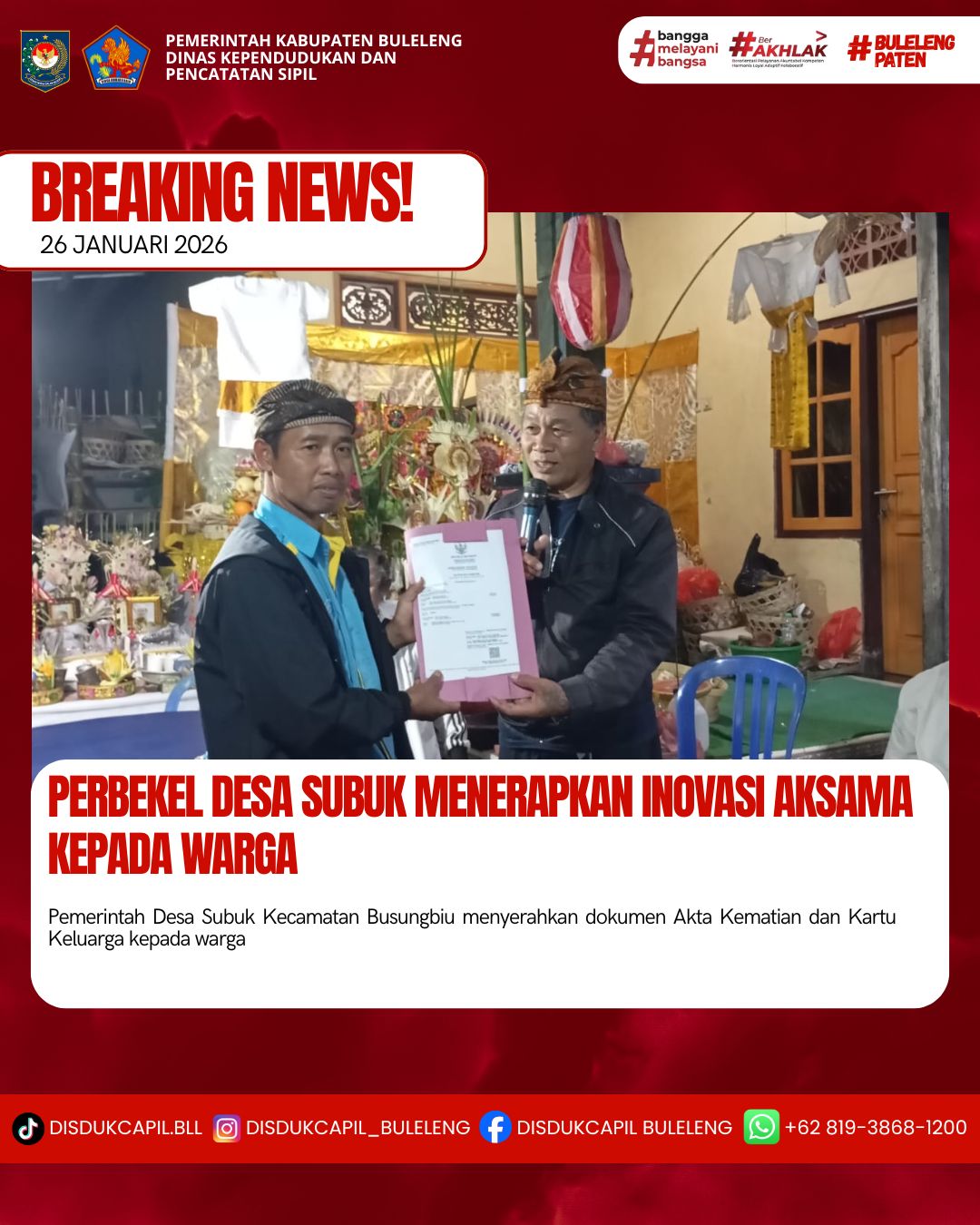 Pemerintah Kabupaten Buleleng melalui Dinas Kependudukan dan Pecatatan Sipil (Disdukcapil) Kabupaten Buleleng memaksimalkan serta mempermudah pelayanan kependudukan masyarakat dengan beberapa inovasi, yakni BALITA (Bayi Lahir Berakta), NYAKSI (Menyerahkan Akta Kawin Saat Acara Perkawinan) dan AKSAMA ( Akta Kematian Diserahkan Saat Masih Berduka) melalui aplikasi Aku Online. Di Desa Subuk Kecamatan Busungbiu, telah diterapkan program Aksama (Akta Kematian Diserahkan Saat Masih Berduka) yang dilakukan secara langsung oleh Perbekel Desa Subuk KETUT SULIADA KUSANA dengan menyerahkan Akta Kematian atas nama Nyoman Simpen dan Kartu Keluarga yang diberikan kepada pihak keluarga atas nama Nyoman Tiarta di Desa Subuk, Kecamatan Busungbiu, Senin (26/1).
