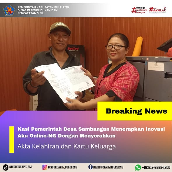 Pemerintah Kabupaten Buleleng melalui Dinas Kependudukan dan Pecatatan Sipil (Disdukcapil) Kabupaten Buleleng memaksimalkan serta mempermudah pelayanan kependudukan masyarakat dengan beberapa inovasi, melalui aplikasi AKU Online-NG. Dimana dalam penerapan aplikasi Aku Online-NG tersebut masyarakat tidak perlu lagi datang ke Dinas Dukcapil untuk melakukan pelayanan langsung cukup dengan datang ke Desa nanti akan dibantu oleh operator Desa masing-masing. Di Desa Sambangan Kecamatan Sukasada, telah diserahkan dokumen kependudukan berupa Akta Kelahiran atas nama Dewa komang swadnyana dan A.A.Atu Ardikawati dan Kartu Keluarga atas nama Dewa Komang Swadnyana yang diserahkan oleh Kasi Pemerintahan Desa Sambangan kepada warga bertempat di Kantor Perbekel Desa Sambangan, Kecamatan Sukasada, Kabupaten Buleleng, Selasa (25/11).