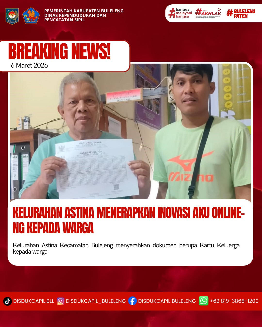 emerintah Kabupaten Buleleng melalui Dinas Kependudukan dan Pecatatan Sipil (Disdukcapil) Kabupaten Buleleng memaksimalkan serta mempermudah pelayanan kependudukan masyarakat dengan beberapa inovasi, melalui aplikasi AKU Online-NG. Dimana dalam penerapan aplikasi Aku Online-NG tersebut masyarakat tidak perlu lagi datang ke Dinas Dukcapil untuk melakukan pelayanan langsung cukup dengan datang ke Desa nanti akan dibantu oleh operator Desa masing-masing. Di Kelurahan Astina Kecamatan Buleleng, telah diserahkan dokumen kependudukan berupa Kartu Keluarga atas nama Putu Ngurah Wardana warga Kelurahan Astina yang diserahkan langsung oleh Kelurahan Astina Kecamatan Buleleng, Kabupaten Buleleng, Jumat (6/3).