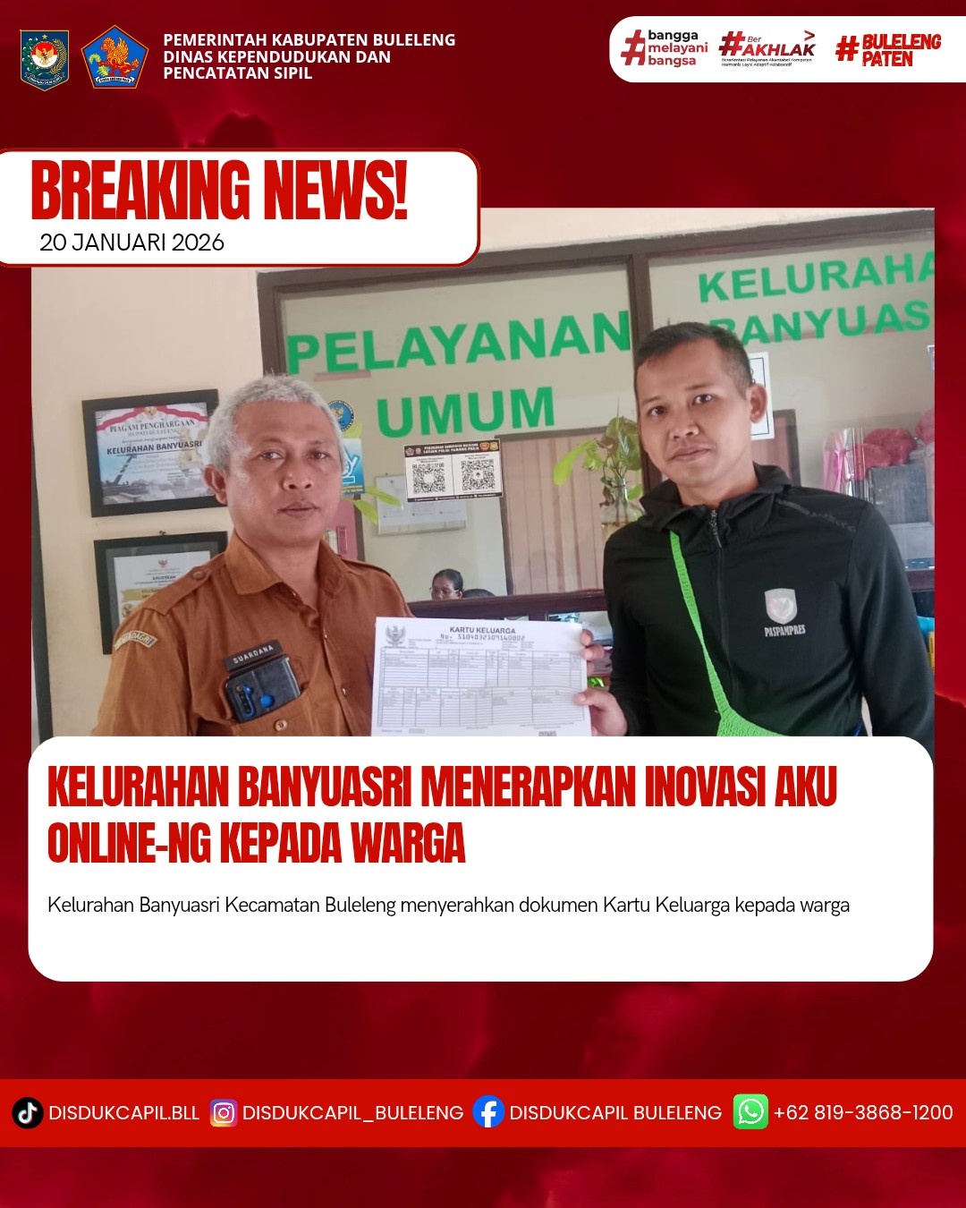 Pemerintah Kabupaten Buleleng melalui Dinas Kependudukan dan Pecatatan Sipil (Disdukcapil) Kabupaten Buleleng memaksimalkan serta mempermudah pelayanan kependudukan masyarakat dengan beberapa inovasi, melalui aplikasi AKU Online-NG. Dimana dalam penerapan aplikasi Aku Online-NG tersebut masyarakat tidak perlu lagi datang ke Dinas Dukcapil untuk melakukan pelayanan langsung cukup dengan datang ke Desa nanti akan dibantu oleh operator Desa masing-masing. Di Kelurahan Banyuasri Kecamatan Buleleng, telah diserahkan dokumen kependudukan berupa Kartu Keluarga atas nama Ridwa Saleh yang beralamat di Asrama Zipur Kelurahan Banyuasri yang diserahkan langsung oleh Kelurahan Banyuasri, Kecamatan Buleleng, Kabupaten Buleleng, Senin (19/1).